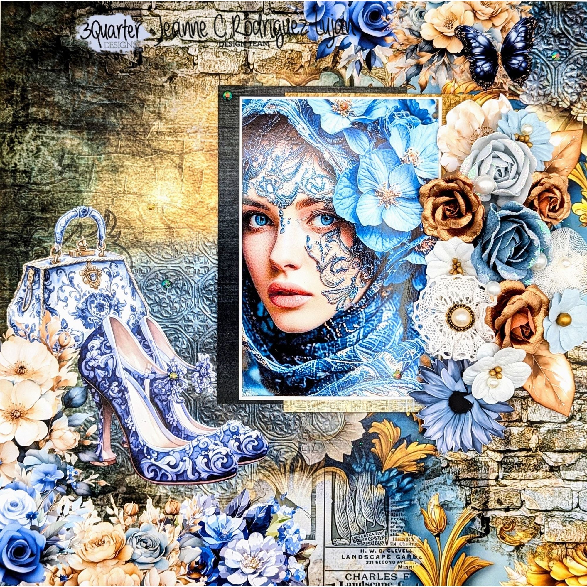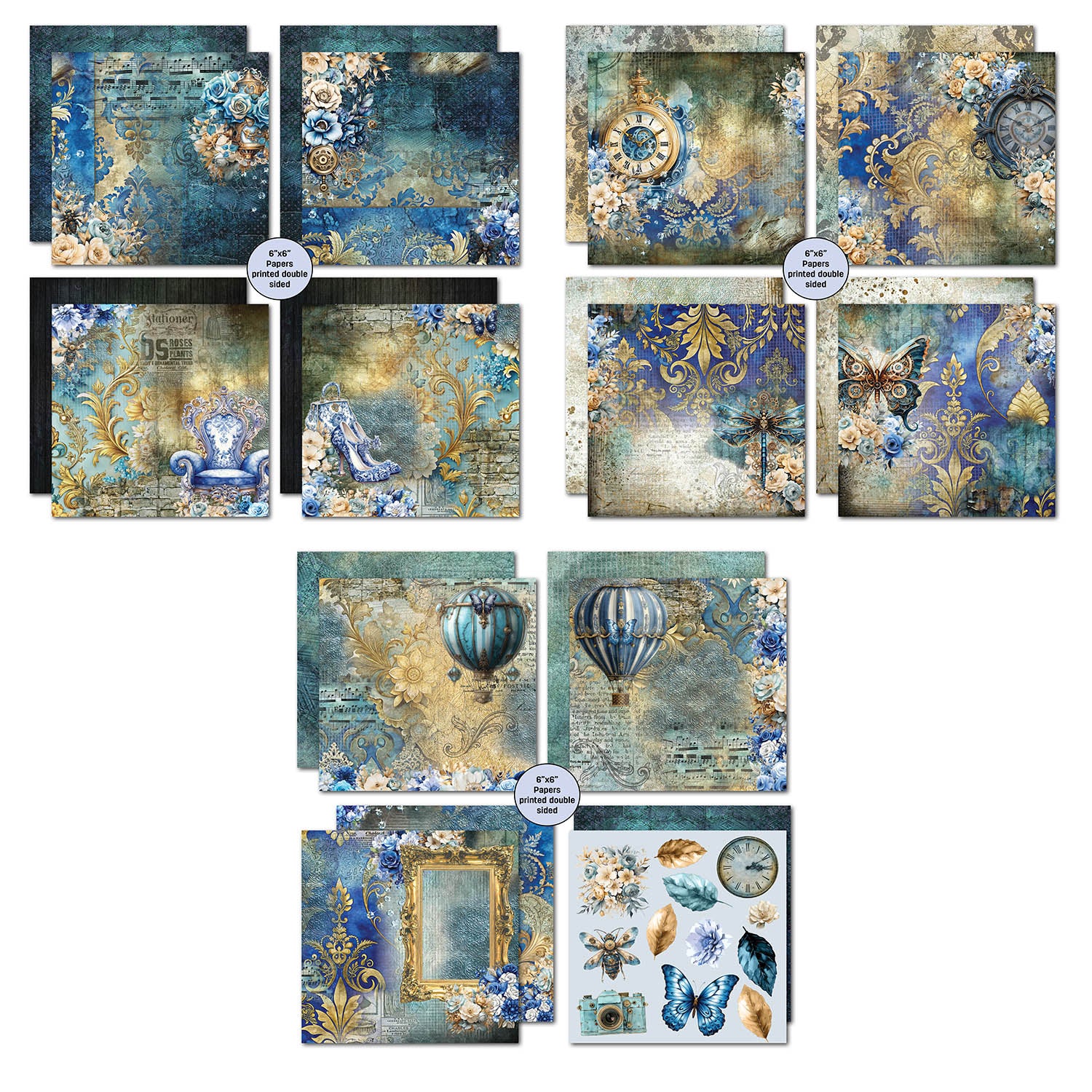 The 3Quarter Designs Grunged Baroque Paper Pack showcases a blend of steampunk and Baroque-era imagery in a refined palette of creams and blues. Designs include gears and cogs, gilded flourishes, handwritten script, vintage furniture and clothing, flowers, timepieces, ornate frames, hot air balloons, steampunk butterflies, rich textures, and more. The pack also features one sheet of coordinating ephemera for fussy cutting, including a clock, leaves, butterflies, a mechanical fly, flowers, and a camera. This 6 x 6-inch double-sided paper pack includes 12 sheets, perfect for cardmaking, scrapbooking, journaling, and mixed media projects.