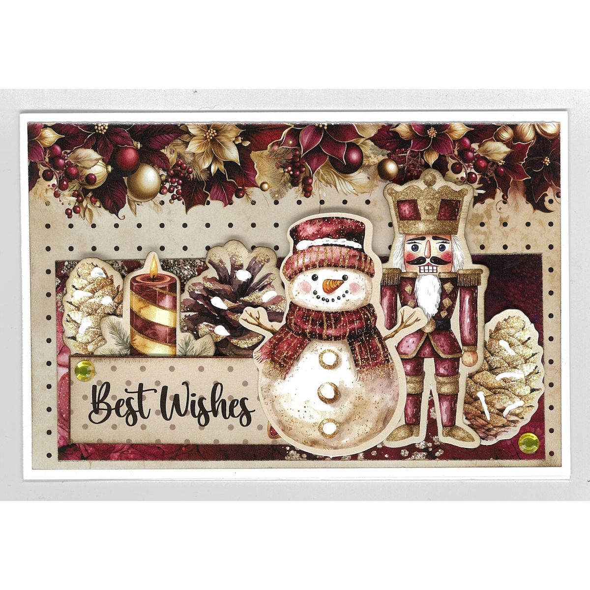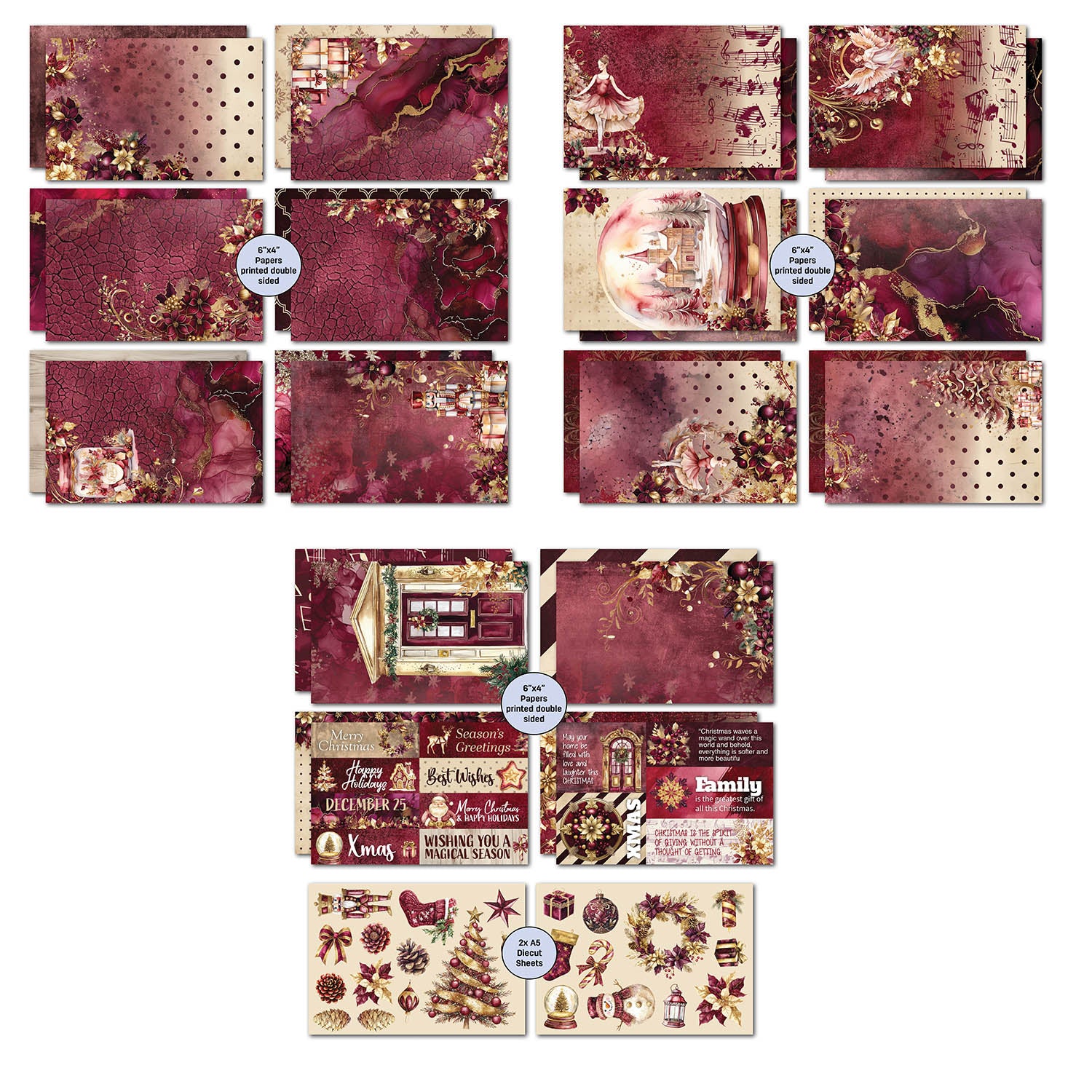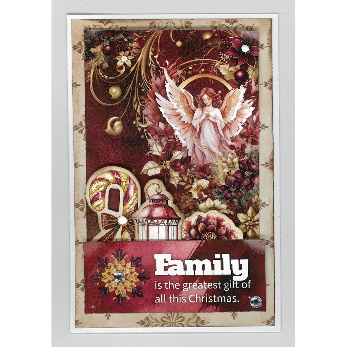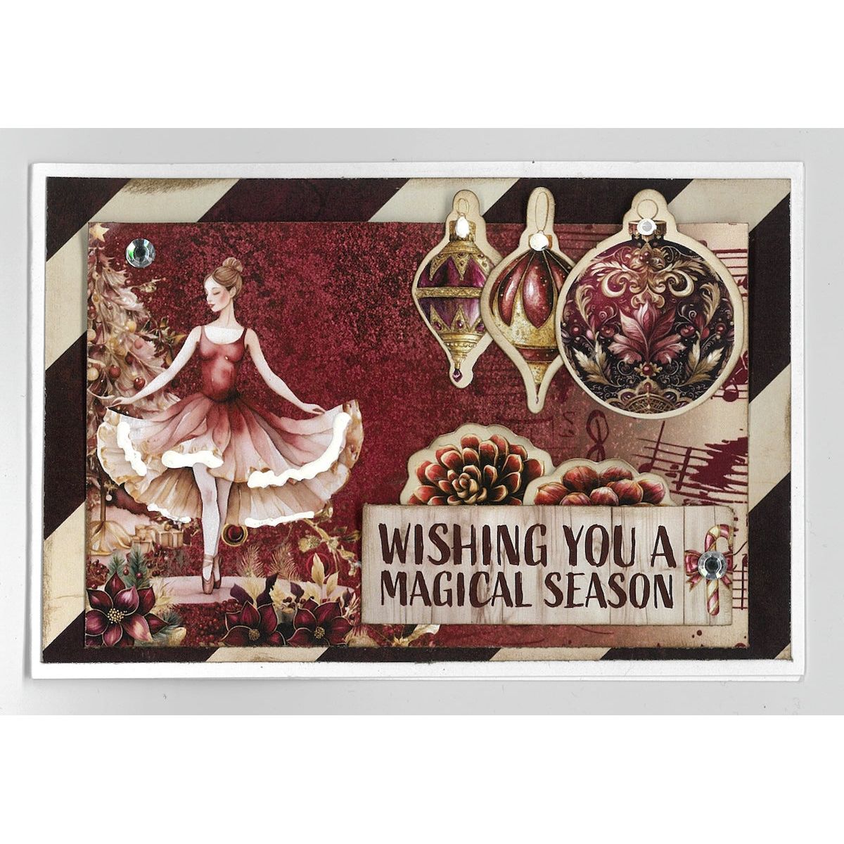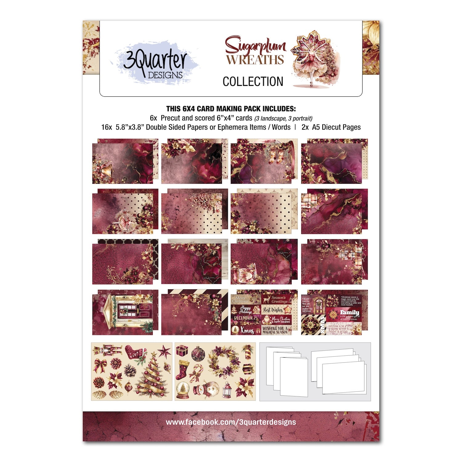 The 3Quarter Designs Sugarplum Wreath 6 x 4 Card Pack showcases elegant Christmas imagery in a rich burgundy and cream palette. Designs feature polka dots, ballerinas, cracked and worn textures, bells, stockings, decorated trees, flowers, presents, angels, sheet music, snowglobes, poinsettias, and more. Two included die-cut sheets offer festive elements such as stars, pinecones, snowmen, wreaths, candles, candy canes, ornaments, and nutcrackers. Sentiments include "Best Wishes," "Merry Christmas," "Happy Holidays," "Family is the greatest gift of all," and "Season’s Greetings," making this pack perfect for holiday cardmaking, journaling, and mixed media projects.