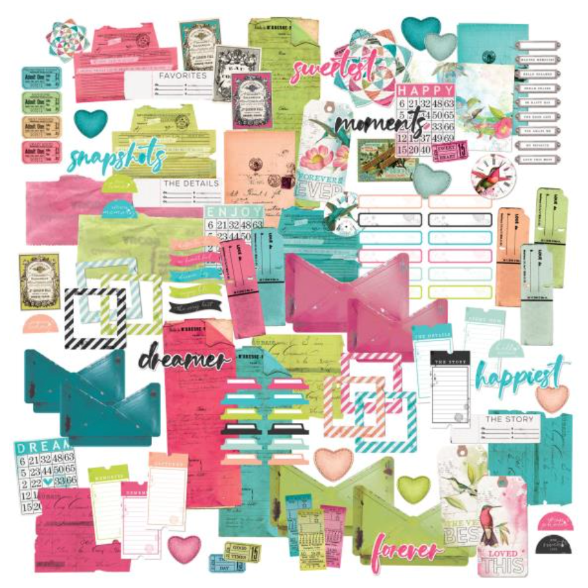 Indulge your creativity with the 49 and Market Kaleidoscope Ephemera Bits! This pack is bursting with 127 individual pieces of ephemera in various sizes, offering a treasure trove of crafting possibilities. Inside, you'll find an eclectic mix of die-cut pieces, including frames, tabs, titles, pockets, labels, tags, and journaling pieces. Whether you're scrapbooking, journaling, or creating mixed media art, these ephemera bits are the perfect addition to add flair and personality to your projects. With a diverse range of elements to choose from, you'll have endless opportunities to express your unique style and bring your vision to life.