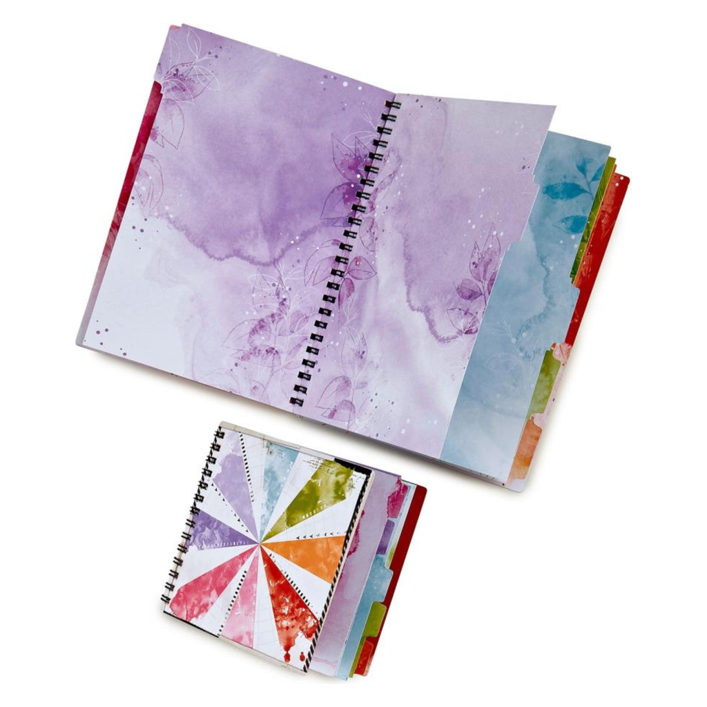 Notebook 1: This notebook measures 5.325x5 inches and comes with covers and 5 tabbed pages. It features a compact size that is great for on-the-go crafting or jotting down notes. The white coiling has a diameter of approximately 0.25 inches.