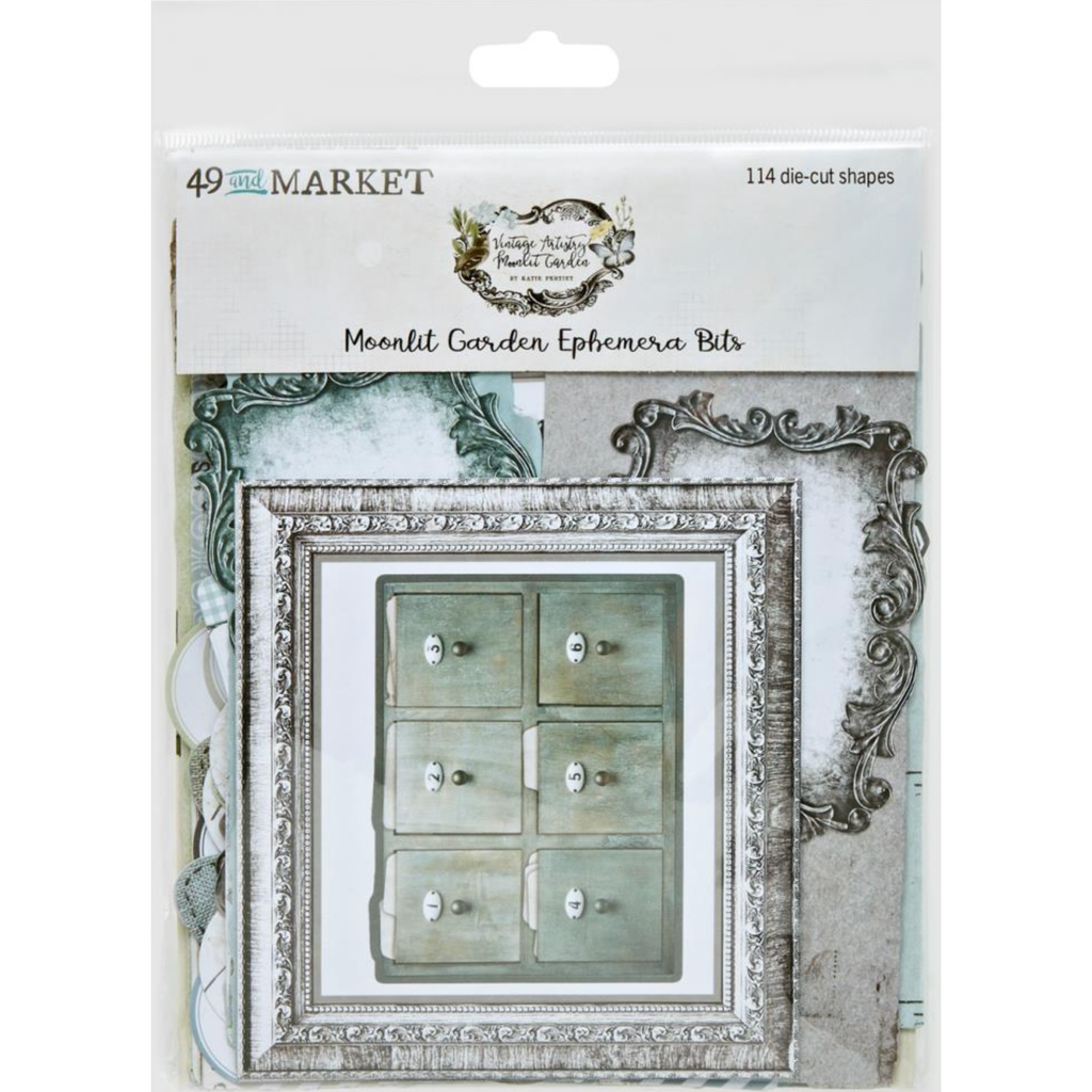 The 49 and Market Vintage Artistry Moonlit Garden Ephemera Bits offer a selection of high-quality and finely detailed ephemera pieces that perfectly complement the Moonlit Garden collection. This assortment of die-cut pieces includes frames, tags, tickets, remnants, tabs, and labels, all designed to coordinate seamlessly with the collection's theme. These pieces serve as ideal embellishments to enhance and complete your crafting projects, providing you with a wide range of creative options limited only by your imagination.