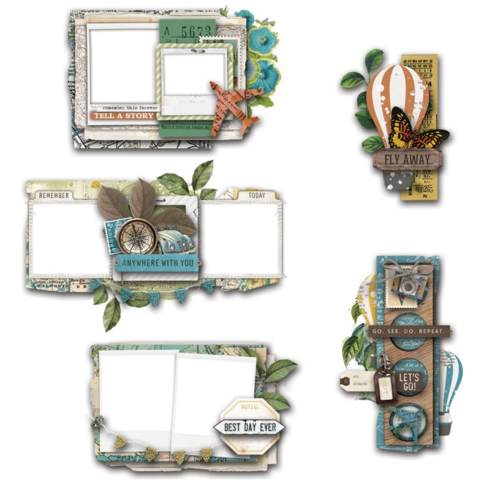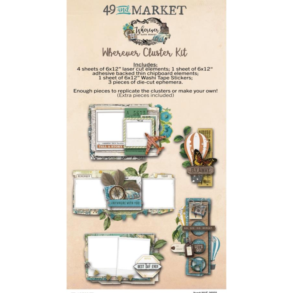 It includes 4 sheets of 6 x 12 inch laser-cut elements, 1 sheet of 6 x 12 inch adhesive-backed thin chipboard elements, 1 sheet of 6 x 12 inch Washi Tape stickers, and 3 pieces of die-cut ephemera. Whether you want to recreate the showcased clusters or craft your own unique assortments, the Wherever Cluster Kit makes creativity effortless!