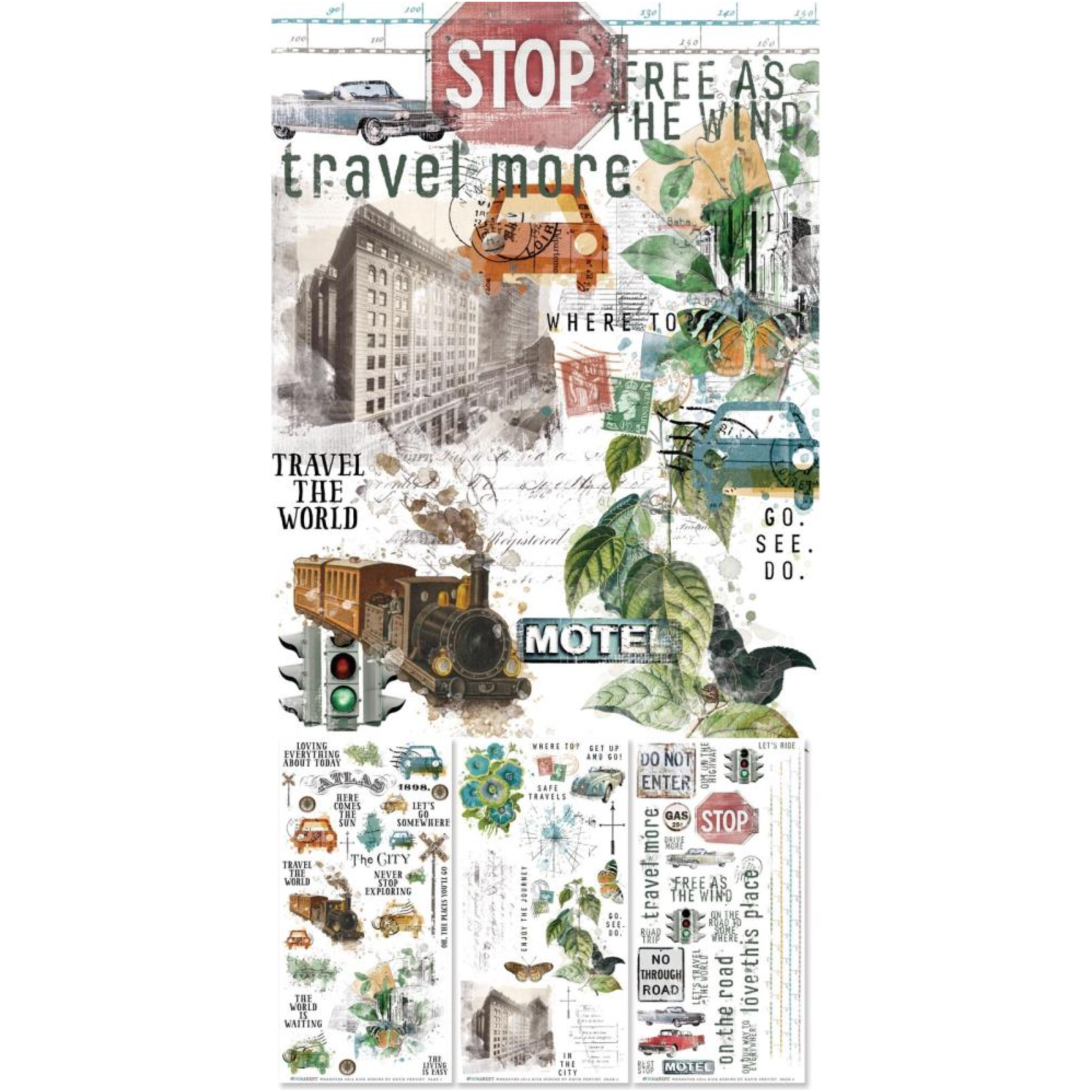 This versatile sheet offers a vast assortment of vintage designs, travel icons, quotes, and distressed elements. With three 6 x 12 inch sheets of assorted transfers, elevate your projects effortlessly. Get creative with the Wherever Ride Rub On Transfer Sheet today!
