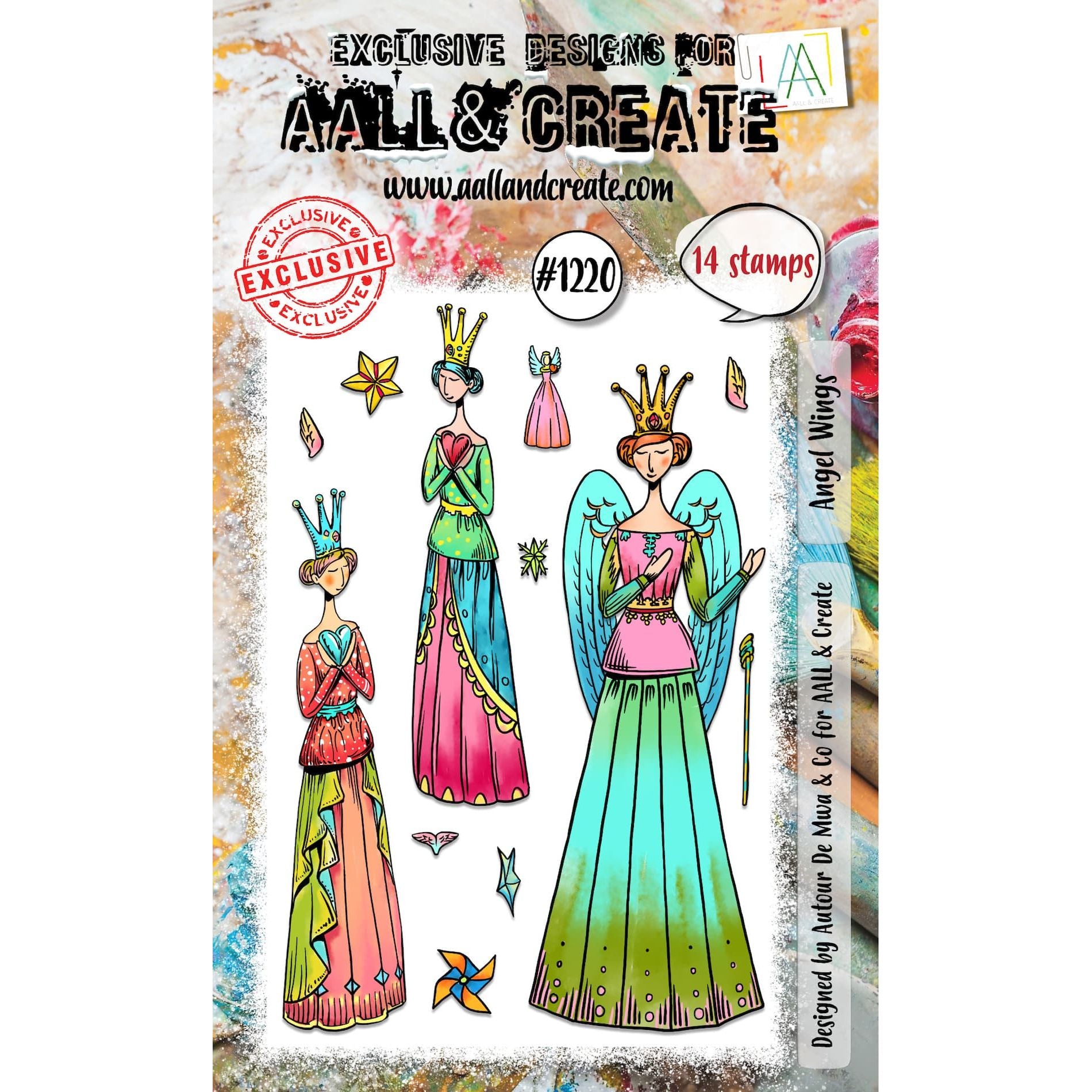AALL & Create Angel Wings A6 Clear Stamp Set was designed by Autour De Mwa & Co. for the Yuletide Extravaganza Collection. Measuring 6 x 4 inches, this set of 14 deeply etched photopolymer clear stamps features a trio of elegant angels adorned in gowns and crowns. Two of the angels hold hearts, while the third showcases majestic wings. Also included are a wand with various toppers like stars and pinwheels, a small angel, and a delicate feather.