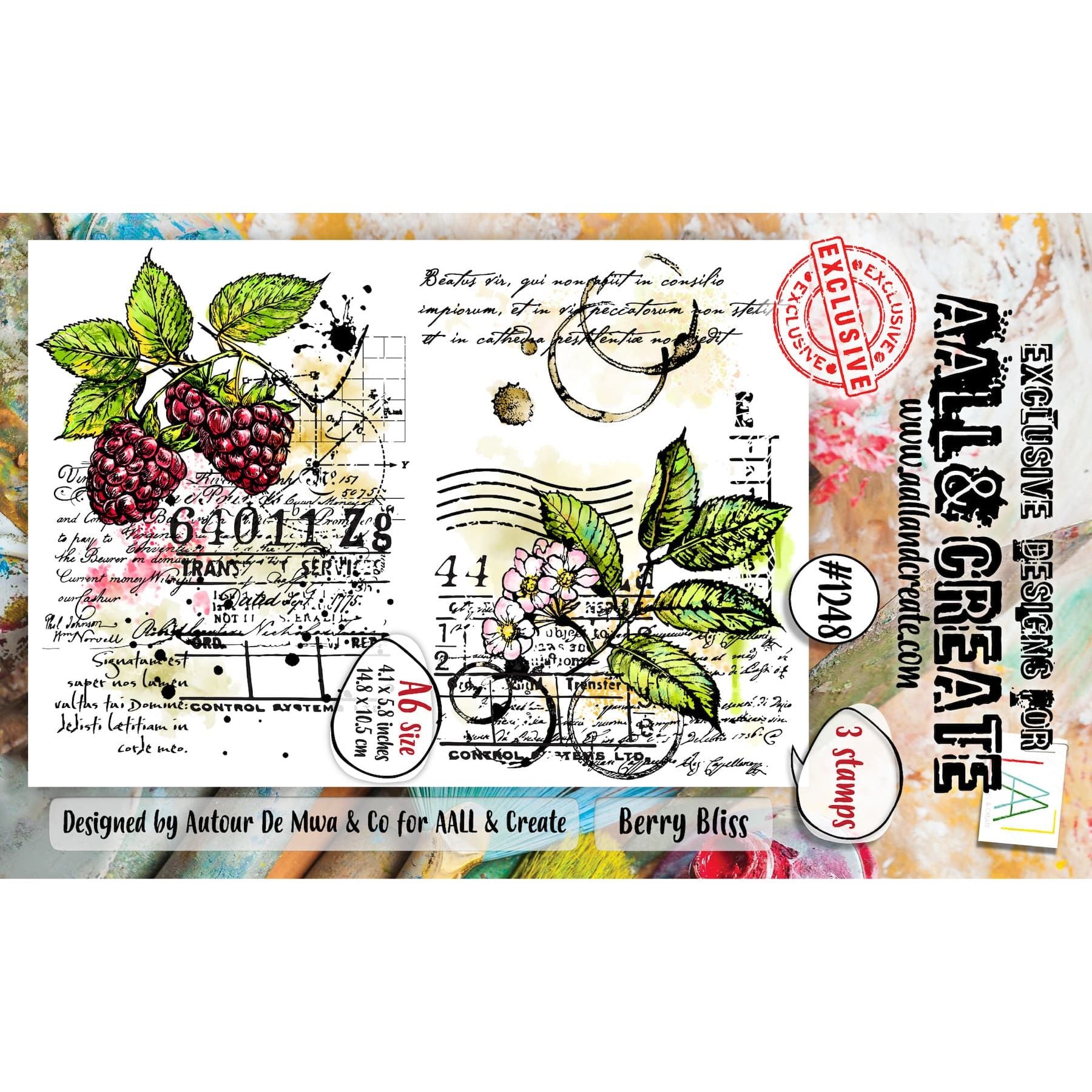The AALL & Create Berry Bliss A6 Clear Stamp Set, part of the Nature’s Impressions Collection designed by Autour De Mwa & Co., measures 6 x 4 inches and includes 3 intricately etched photopolymer stamps. The designs showcase three unique collages: one features a leafy twig of berries surrounded by numbers, script, grids, and splotches; another includes a leafy twig with delicate flowers, accented by postage marks, script, and ledger numbers; and the third presents script with two overlapping coffee rings. Perfect for adding layers of texture and detail to any creative project.