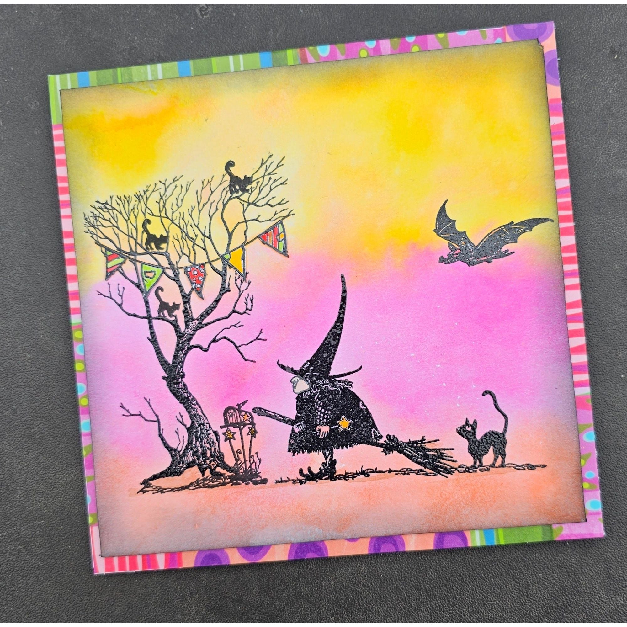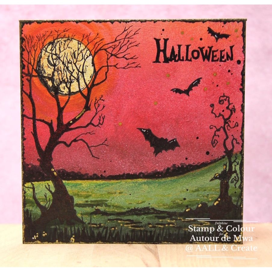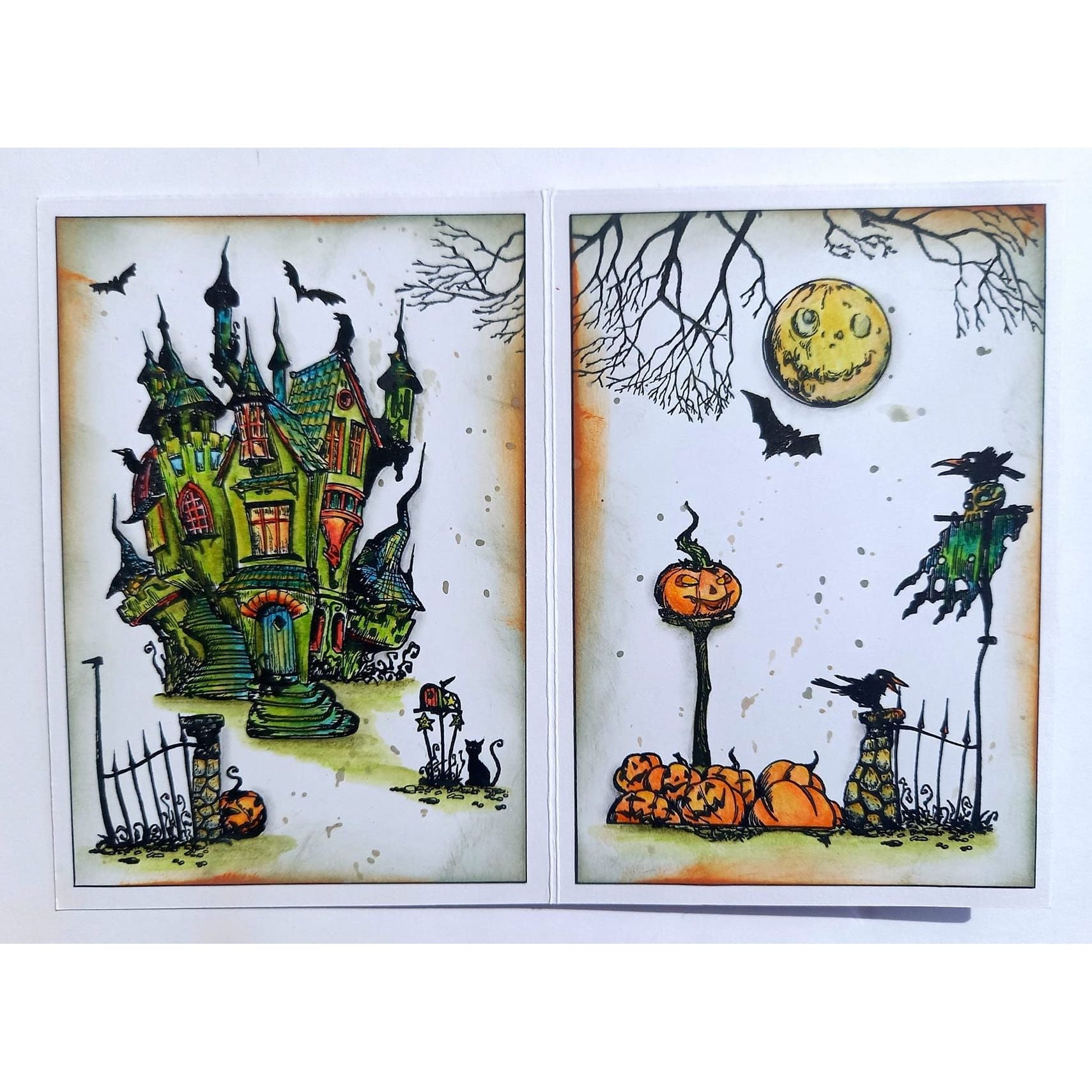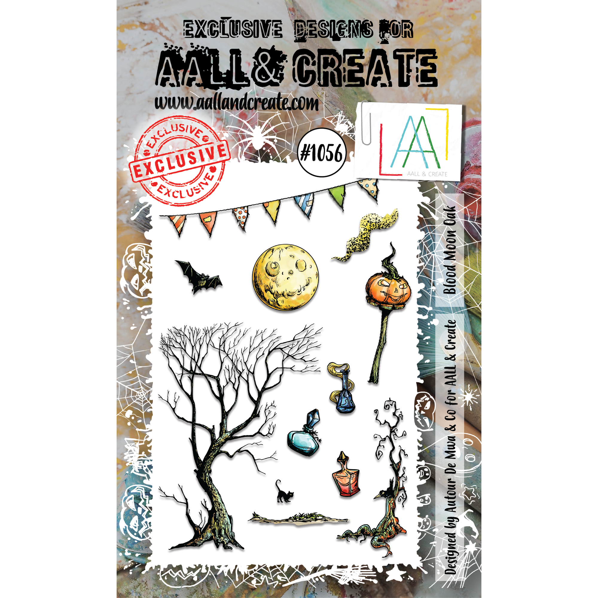 The AALL & Create Blood Moon Oak A6 Clear Stamps, designed by Autour De Mwa, add a touch of eerie beauty to your creative projects. This 4x6-inch clear stamp set comprises 12 deeply etched photopolymer stamps, which adhere effortlessly to any clear acrylic block. The centerpiece of the collection showcases a haunting old tree, accompanied by a jack-o'-lantern on a pedestal, evoking a spooky atmosphere. The set also includes elements like a patch of land, a diminutive tree, two intriguing potion bottles, drifting smoke, a bat, a full moon with a crooked smile, and charming pennants designed to adorn a Halloween Tree. These stamps offer a comprehensive range of eerie and enchanting elements, ideal for infusing a bewitching touch into your Halloween projects.