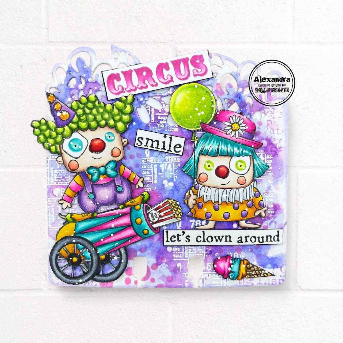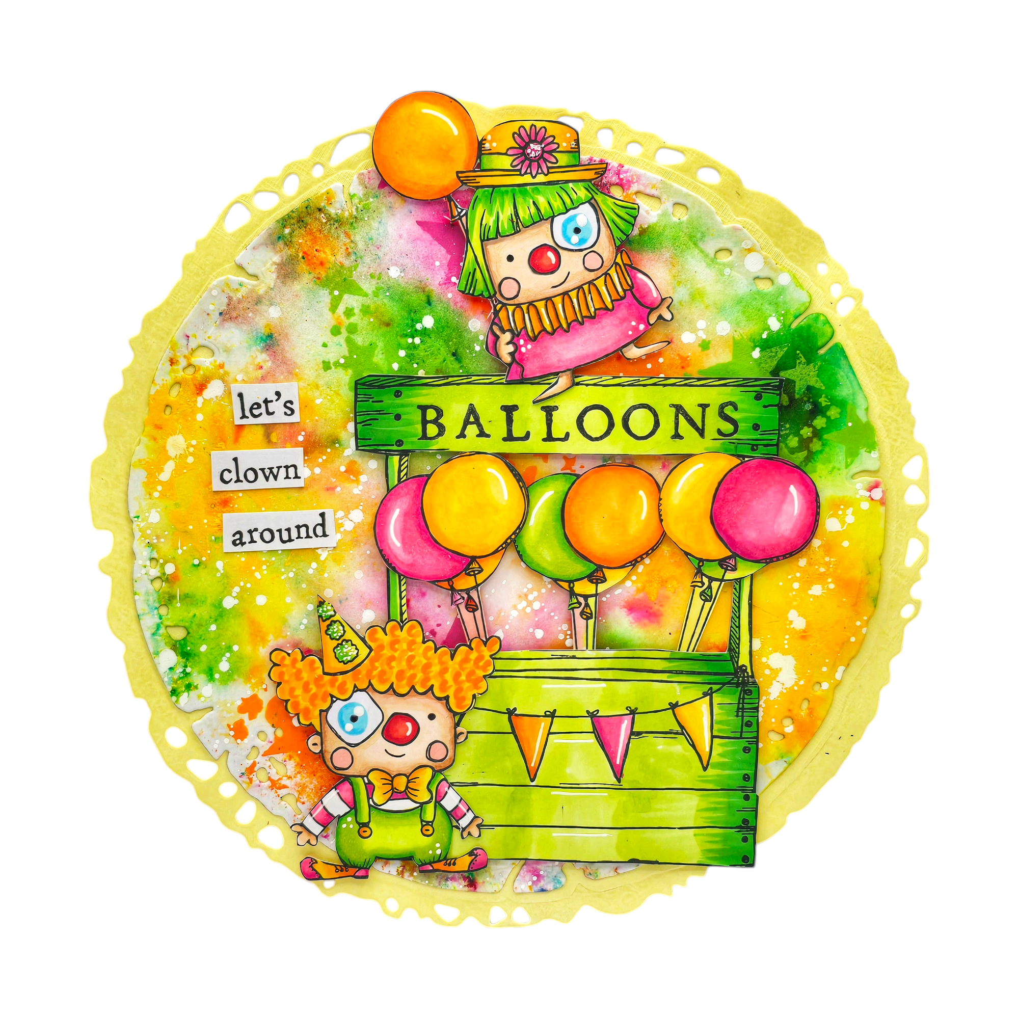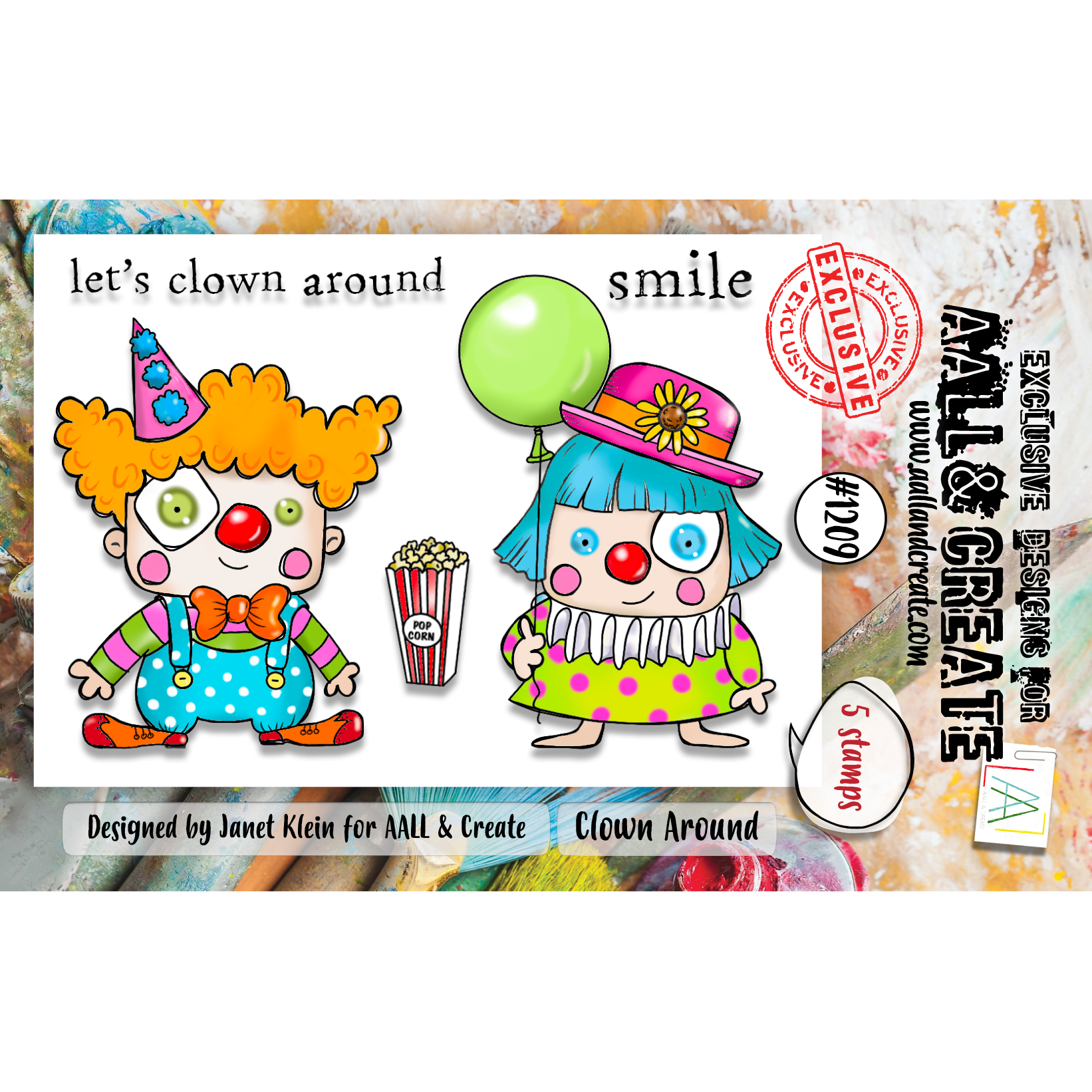 The Clown Around A7 Clear Stamps, designed by Janet Klein for The Circus Act Collection, measures 3 x 4 inches and includes 5 deeply-etched photopolymer stamps. The designs feature two whimsical clowns with crazy hair and hats—one in a dress holding a balloon, and the other in overalls, a bowtie, and big shoes. Also included is a box of popcorn and the phrases "Let’s clown around" and "Smile." These playful designs add a fun, lighthearted touch to any craft project.