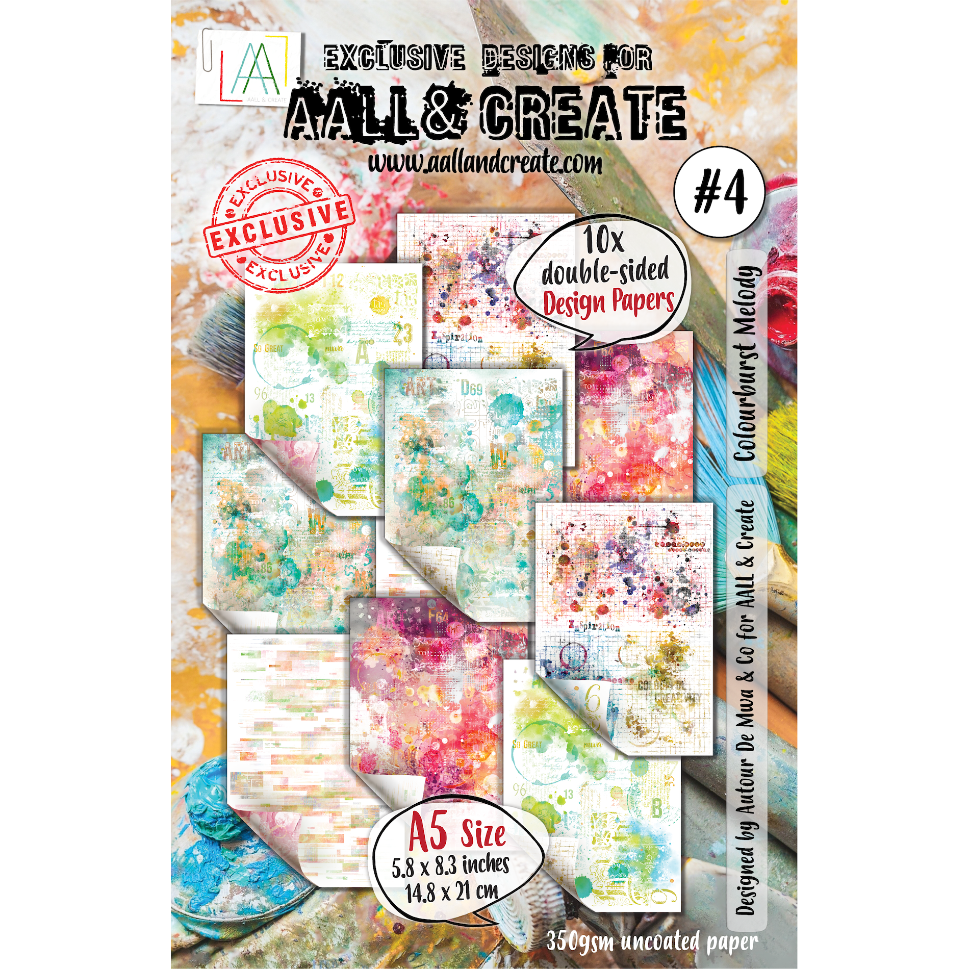 AALL & Create Colourburst Melody A5 Design Paper, crafted by Autour De Mwa & Co, offers a captivating array of unique designs and patterns that are sure to inspire creativity in all your paper-crafting endeavors. Each pack contains 10 double-sided sheets of high-quality heavyweight paper, with a substantial weight of 350gsm, ensuring durability and versatility in your projects. Measuring approximately 5.8 x 8.3 inches, these A5-sized sheets are perfectly sized for a wide range of crafting applications, from card making to scrapbooking and beyond. The designs featured in the collection are characterized by their bold and dynamic aesthetic, incorporating collages of grids, paint spills and drips, numbers, and more. The vibrant color palette, consisting of blues, greens, yellows, purples and reds, adds a lively and energetic touch to your creations, making them stand out with visual impact.