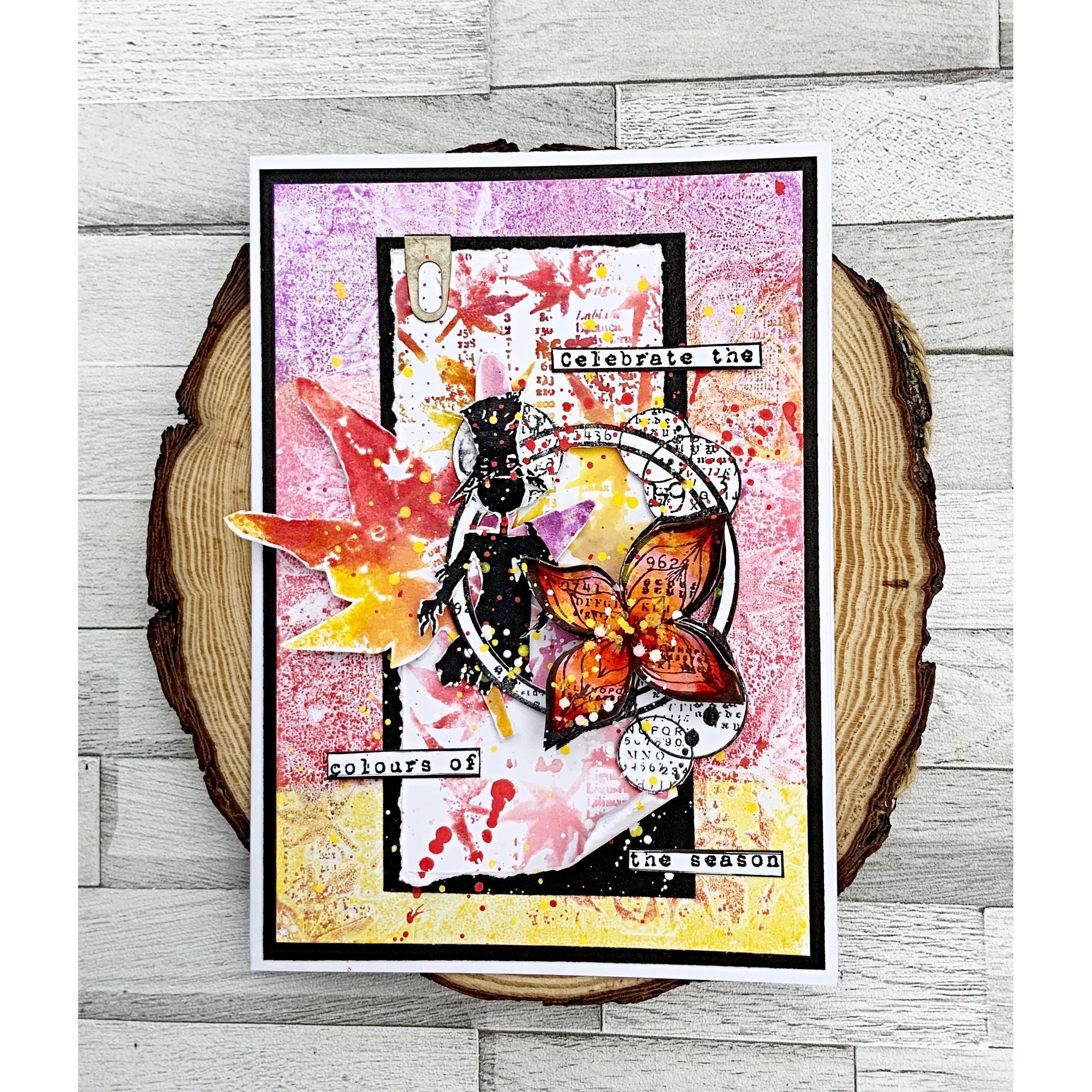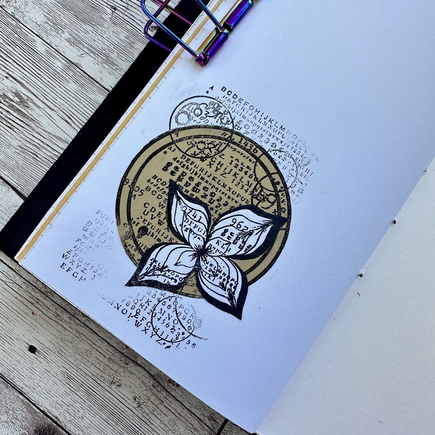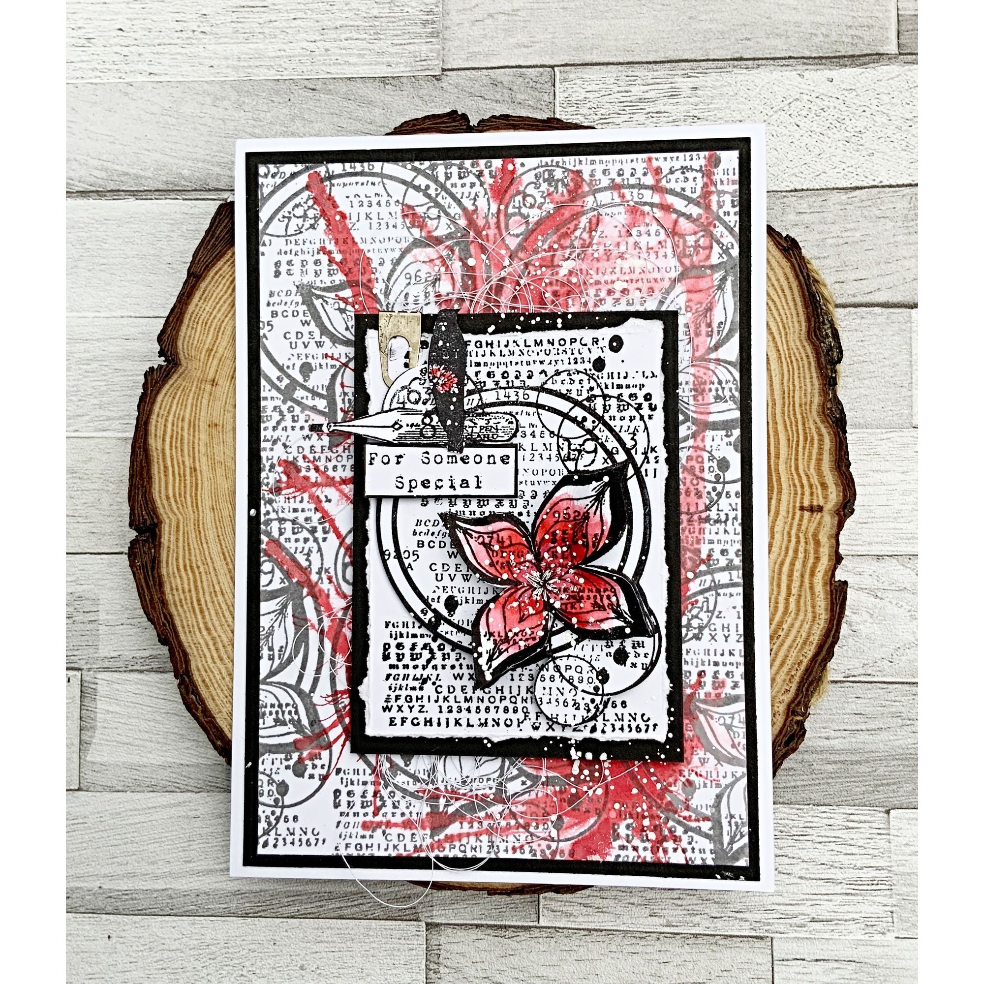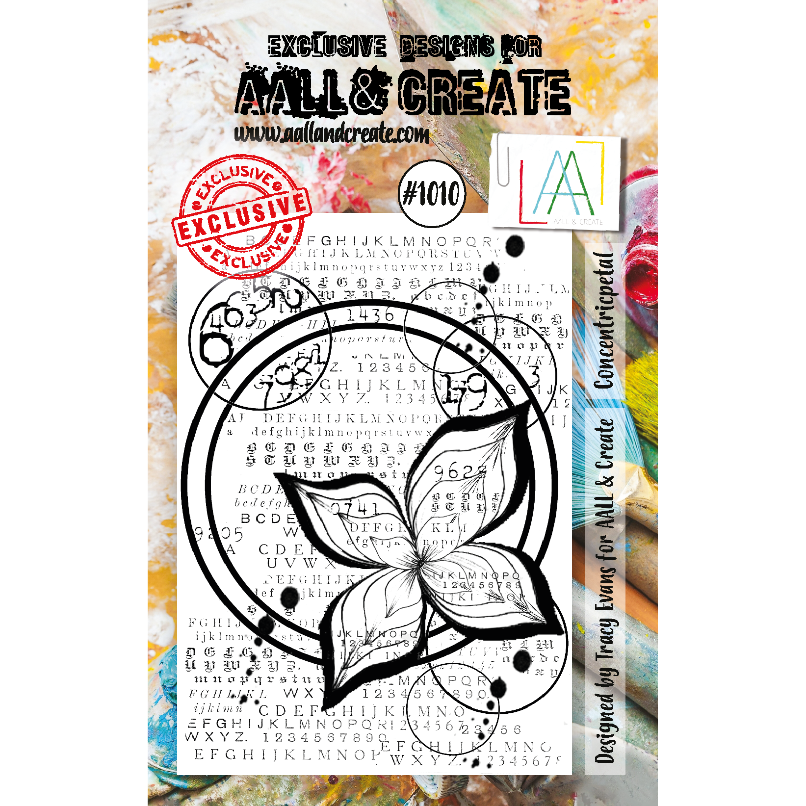 The AALL & Create Concentricpetal A7 Clear Stamp is part of the Autumn Dreamin’ Collection by Tracy Evans. Measuring 3x4 inches, this clear, etched photopolymer stamp set comprises a single, captivating piece. Within this stamp, you'll find an engaging collage featuring a background adorned with the repeating alphabet in various fonts, overlaid with circles and numbers, and a charming flower centerpiece.