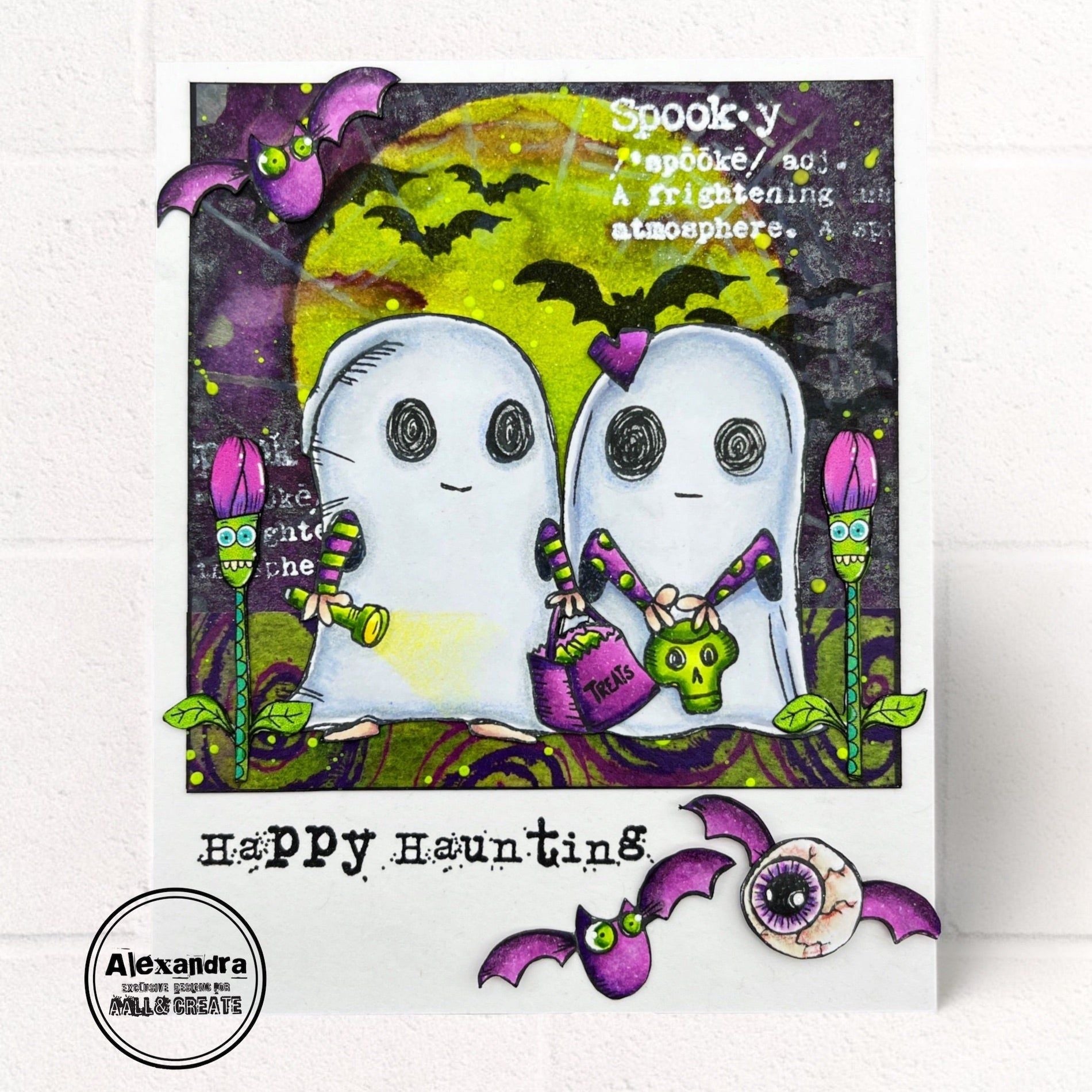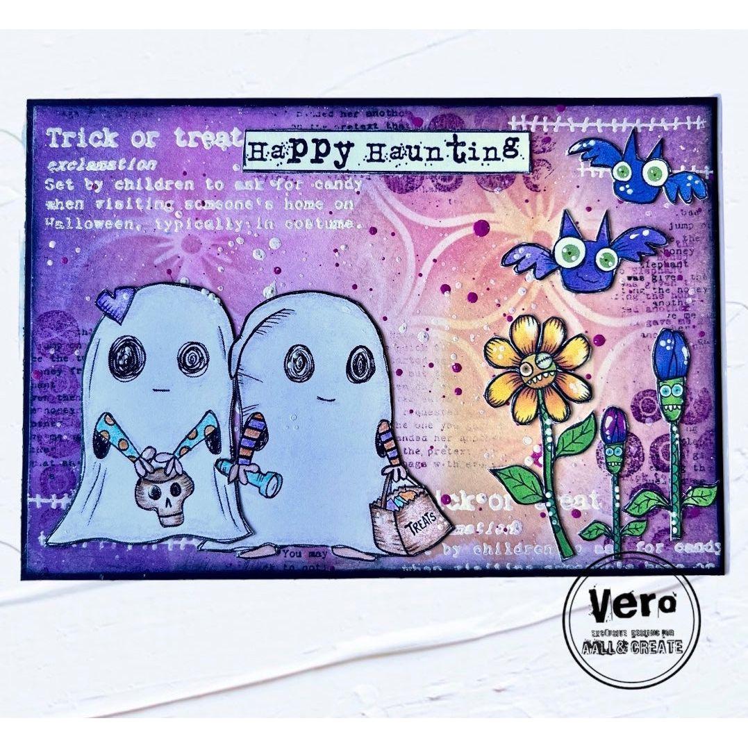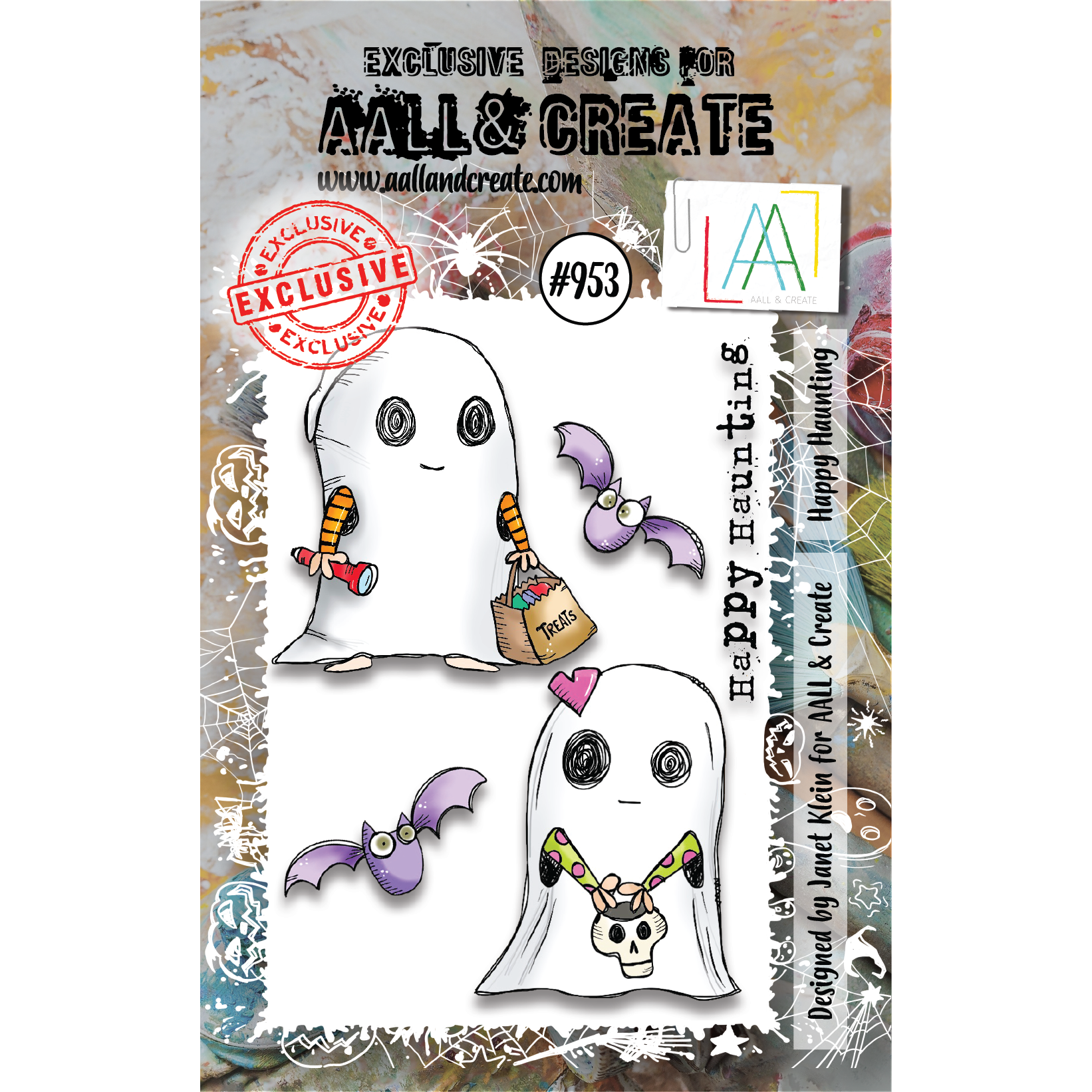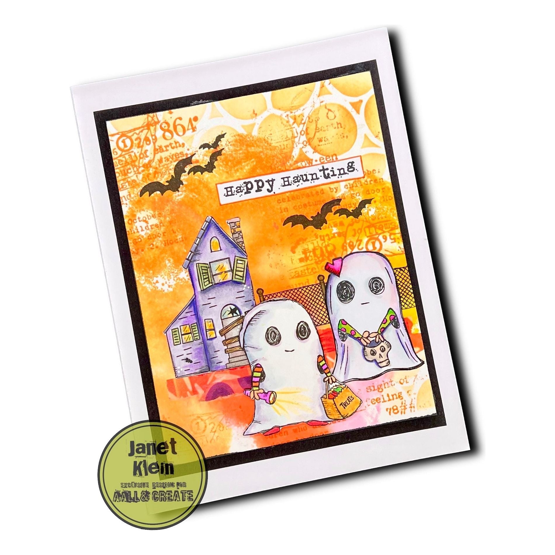 The AALL & Create Happy Haunting A7 Clear Stamps, designed by Janet Klein, infuse a playful essence into your Halloween-themed projects. This 3x4-inch clear stamp set includes 5 deeply etched photopolymer stamps, adhering seamlessly to any clear acrylic block. The set features two kids dressed as simple ghosts, brimming with excitement as they head out for trick-or-treating with their baskets. The scene is completed with two whimsical bats, adding to the festive ambiance. The set also includes the phrase "Happy Haunting," encapsulating the spirit of Halloween with its joyful tone.