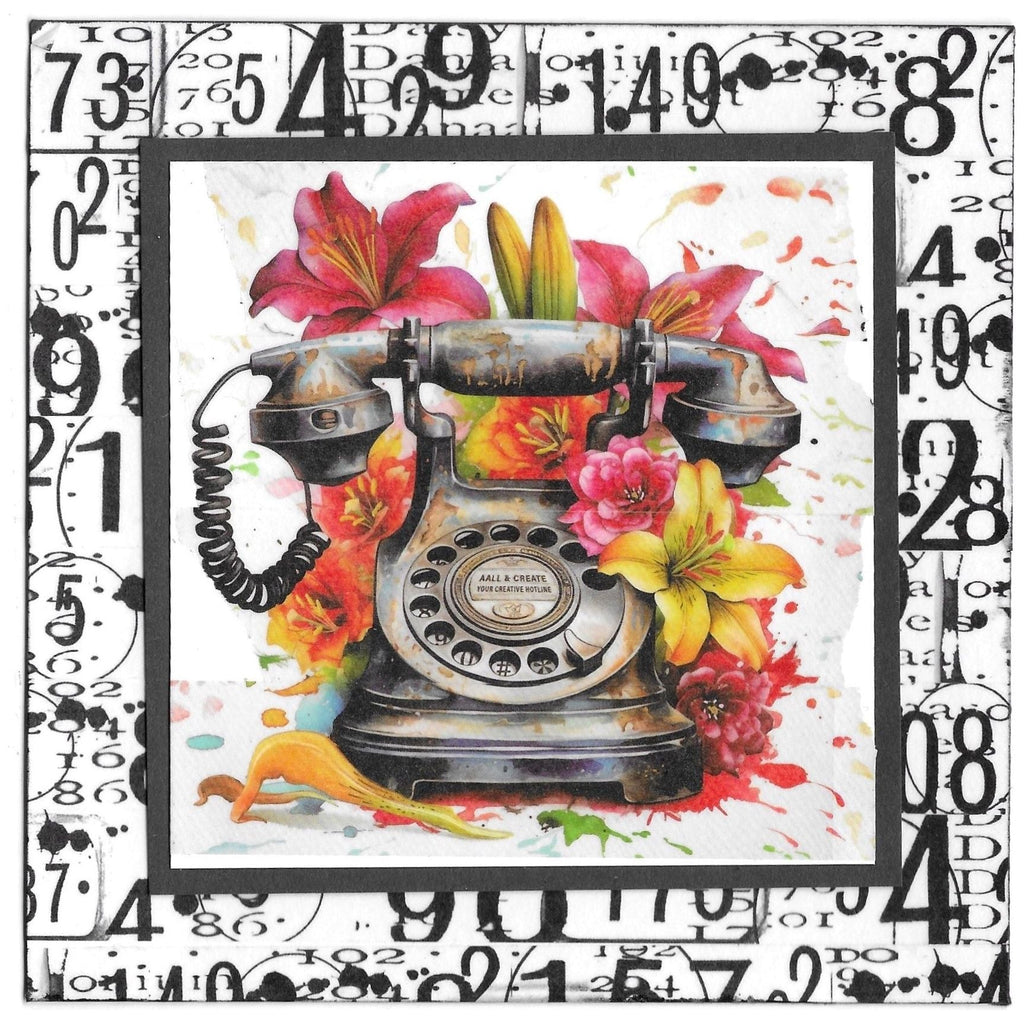 The AALL & Create Hotline Ring Washi Tape, part of the Layer it Up Collection, measures approximately 1 inch x 10 meters. This tape features vintage rotary telephones adorned with tropical florals and colorful paint splatters, adding a vibrant touch to your projects.
