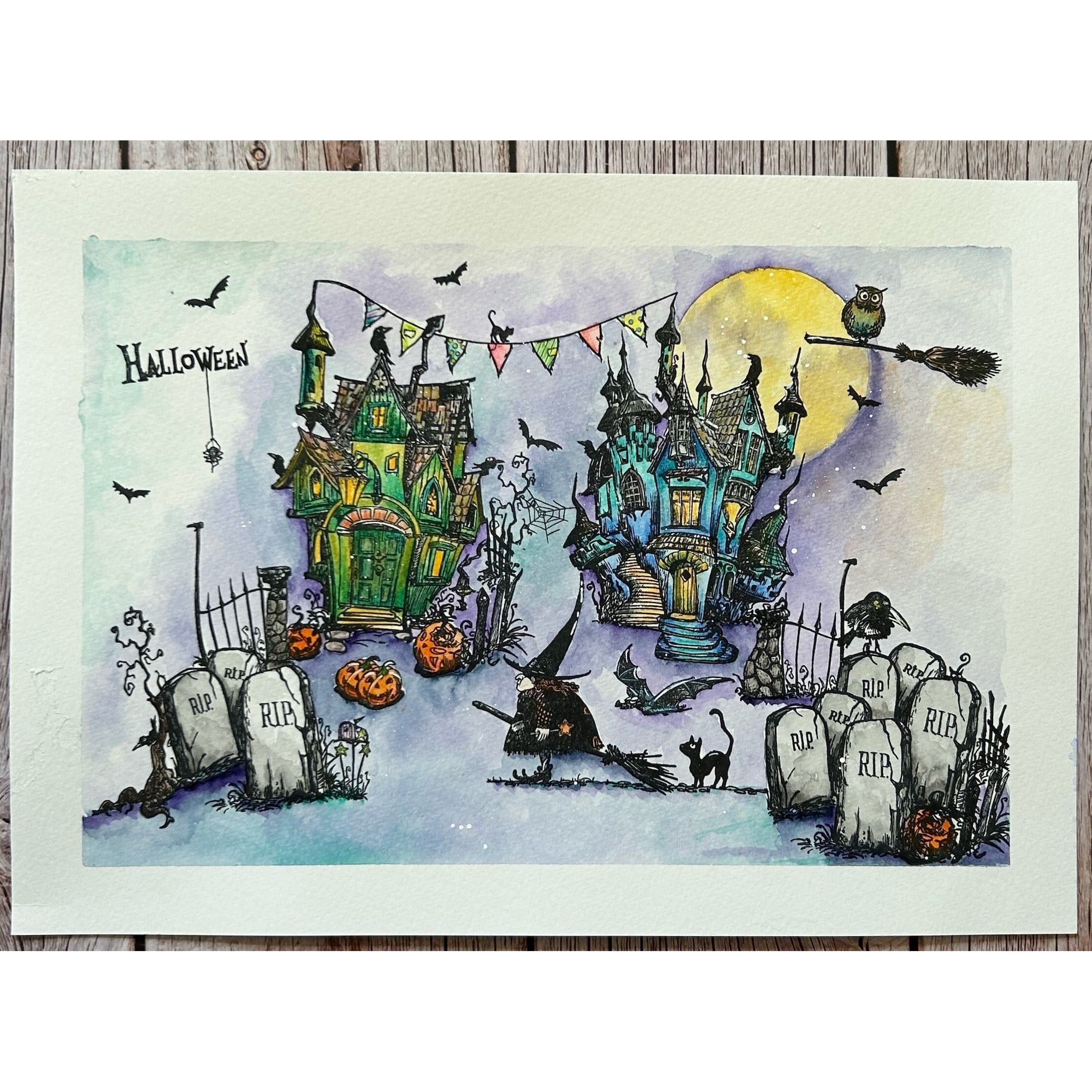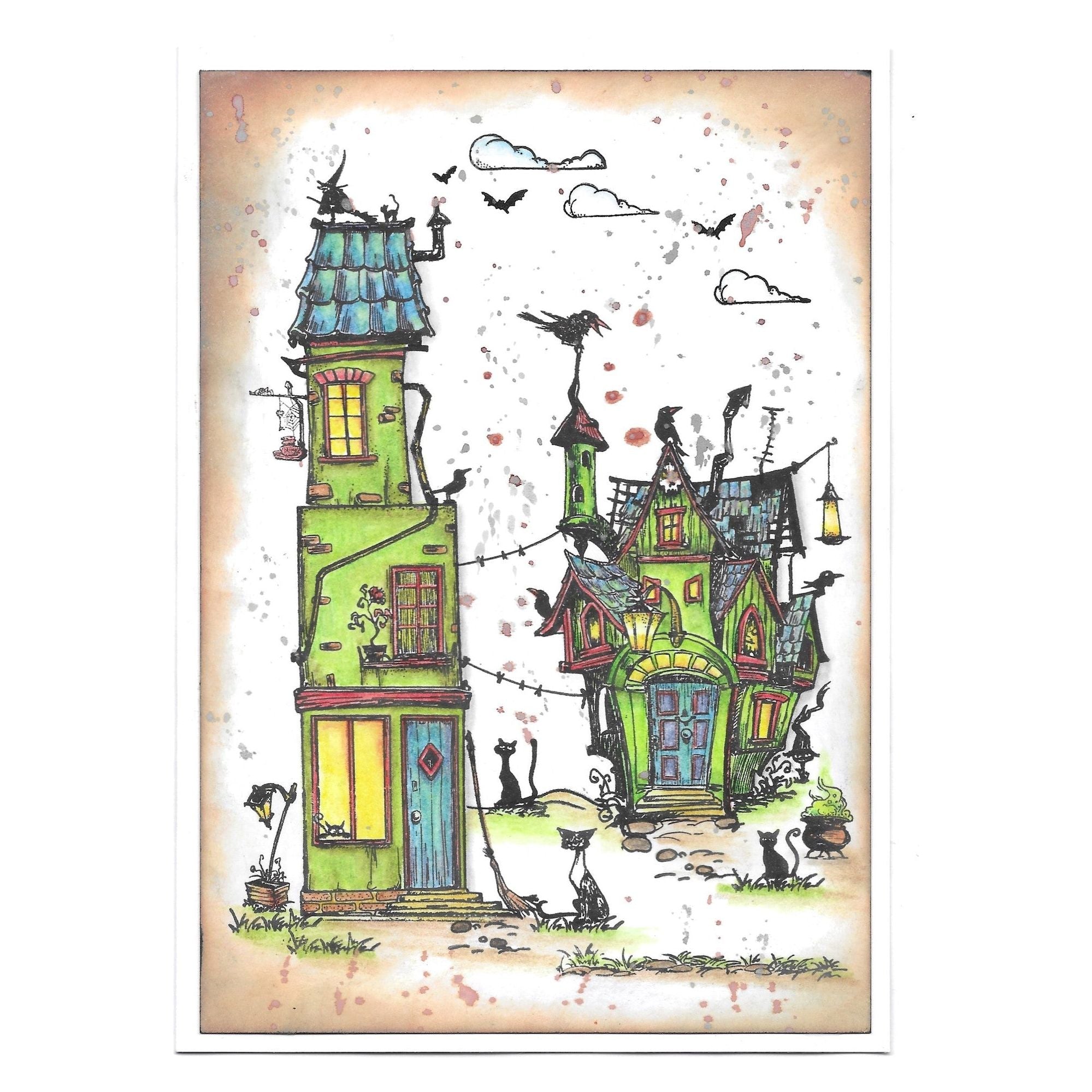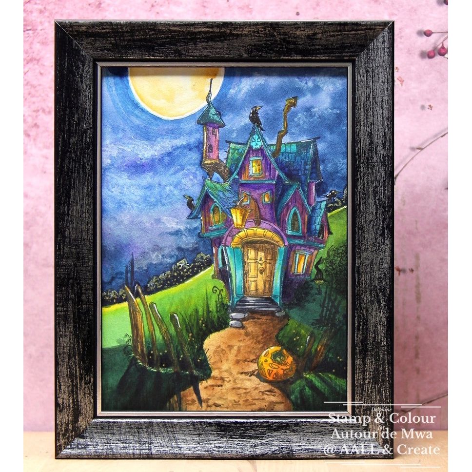 The AALL & Create Howler's House A6 Clear Stamps, designed by Autour De Mwa, offer an ideal creative asset for Halloween-themed projects. This 4x6-inch clear stamp set contains 18 deeply etched photopolymer stamps that adhere effortlessly to any clear acrylic block. The design showcases a comprehensive assortment for creating a spooky Halloween scene. It features a rickety house, a weathered fence, a jack-o'-lantern, a cat, a crow, bats, a broomstick, and essential words like "RIP" and "BOO!" This collection of stamps allows you to craft an eerie atmosphere with ease, making it perfect for capturing the essence of Halloween.