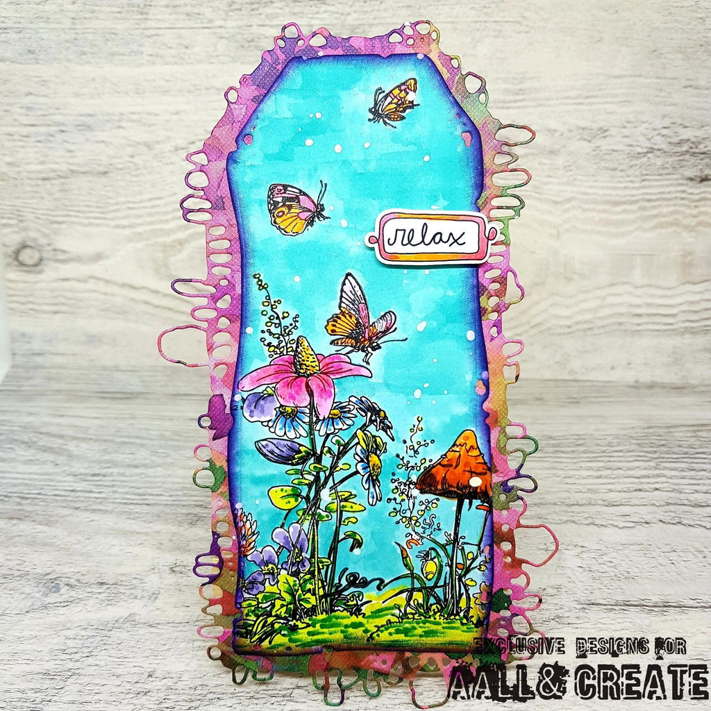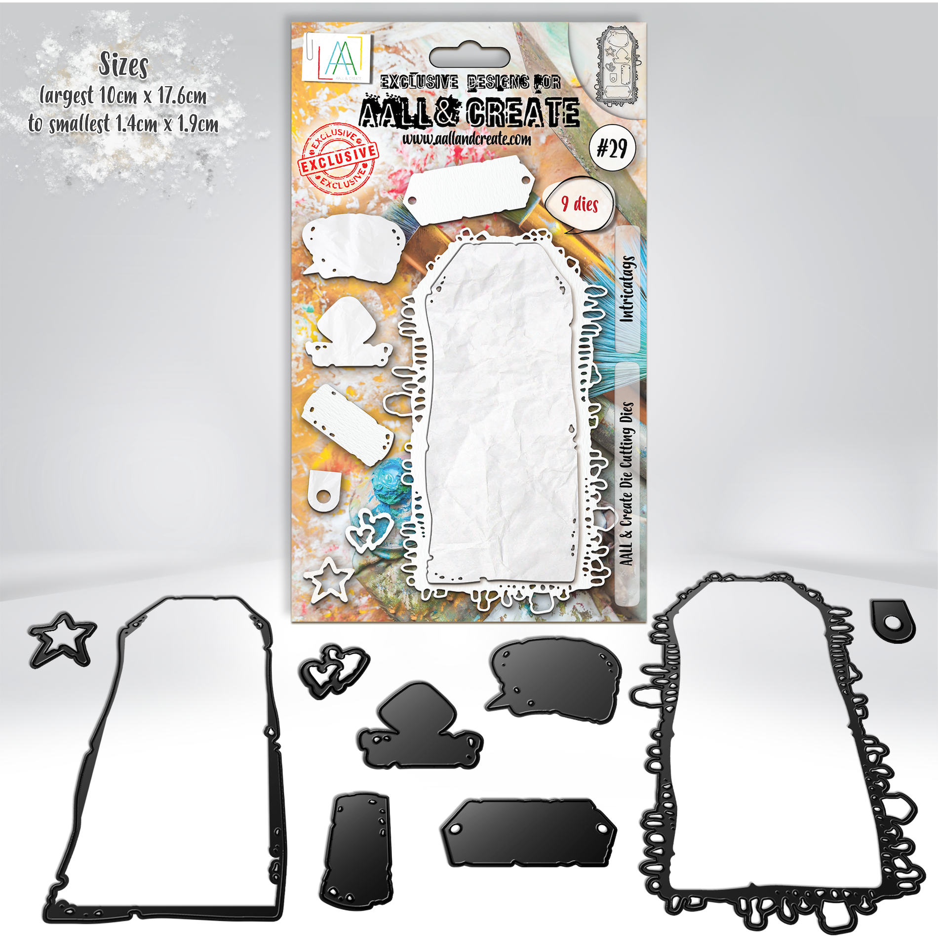 The AALL & Create Intricatags Dies, designed by Autour de Mwa & Co., offer a set of high-quality, deeply etched wafer-thin dies. This collection consists of nine distinct elements. The largest die measures approximately 3.94 x 6.93 inches, while the smallest is about 0.55 x 0.75 inches in size. Included in this set are two substantial tags, one with distressed edges and the other adorned with funky loops, along with three smaller tags or labels, a speech bubble, a tag holder or hanger featuring a hole, and charming heart and star designs.