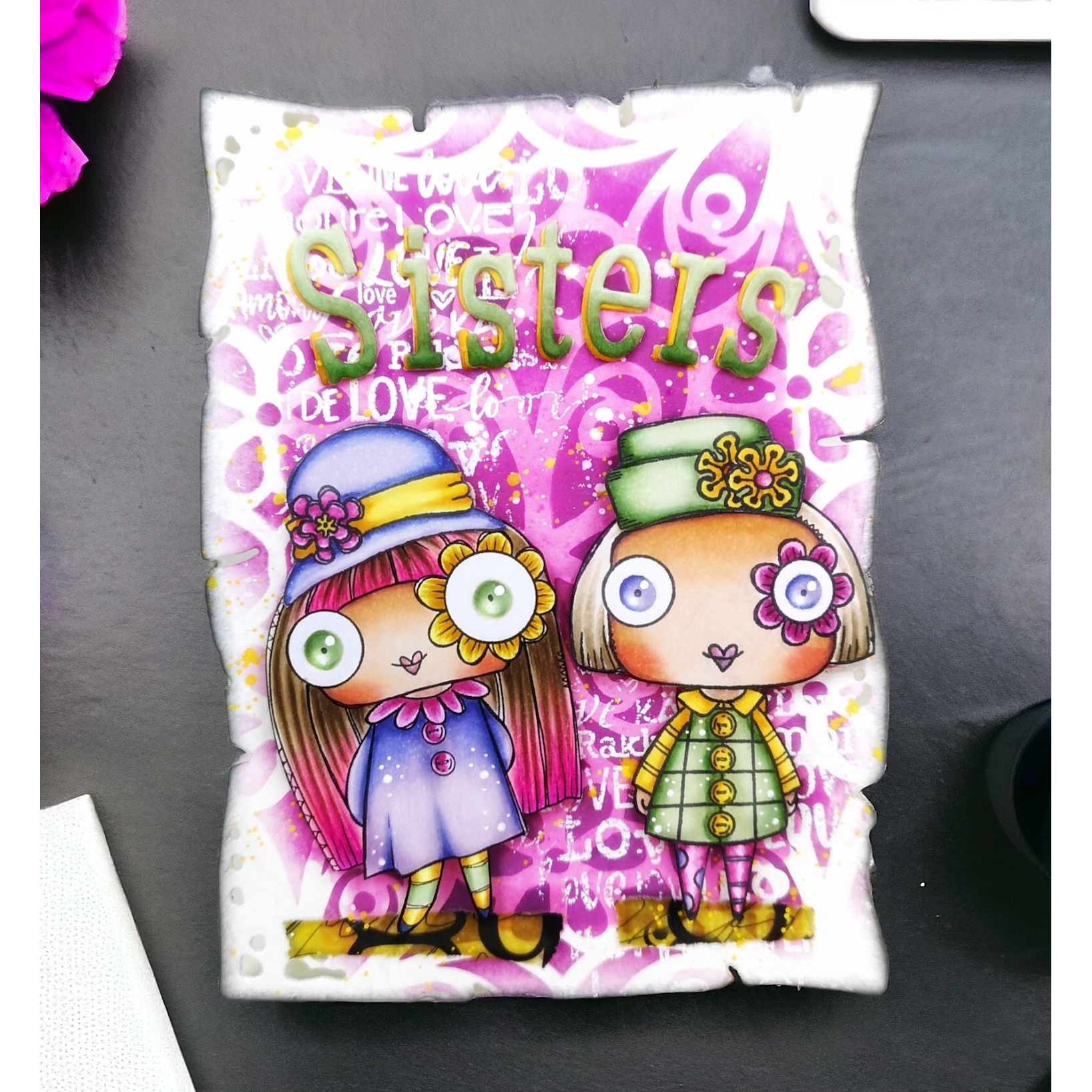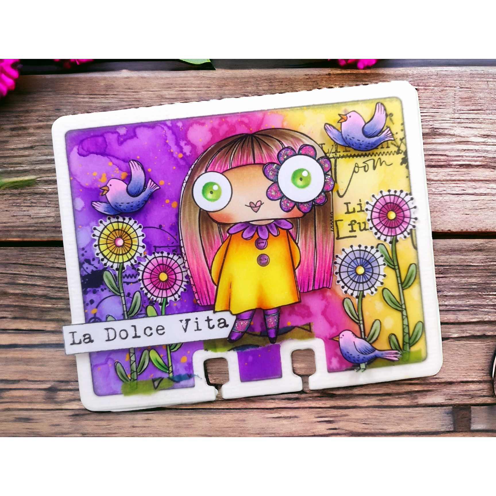 This delightful set, designed by Janet Klein, is a wonderful addition to her Paint Your World Collection. These high-quality, deeply etched photopolymer clear stamps effortlessly adhere to any clear acrylic block. Measuring 3x4 inches, the set includes 6 pieces featuring a cute girl standing in a dress with long hair and a flower eye, 2 birds, a tall flower, and the words "La Dolce Vita" and "the sweet life."
