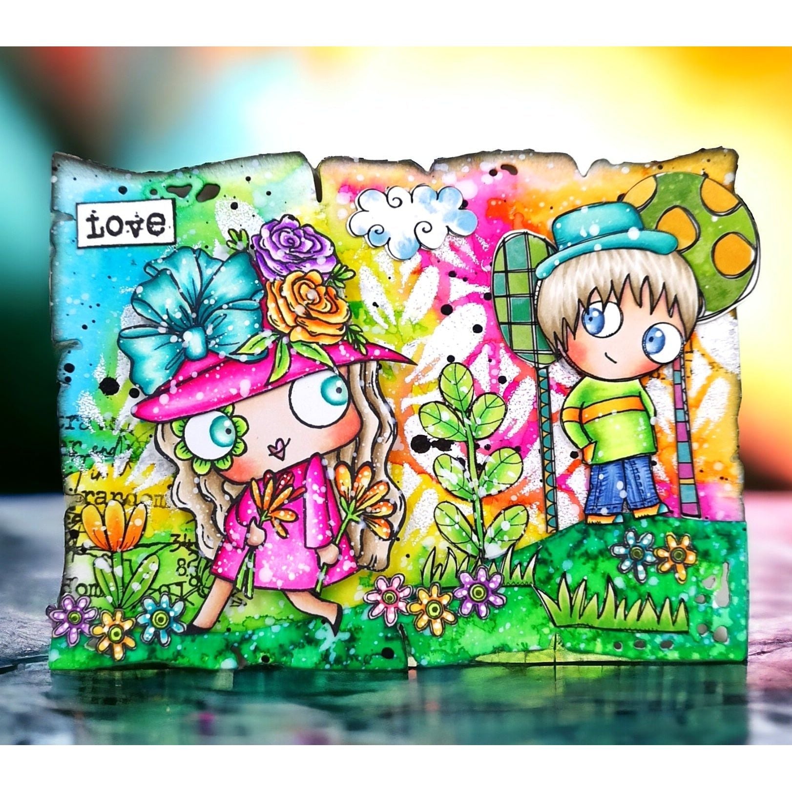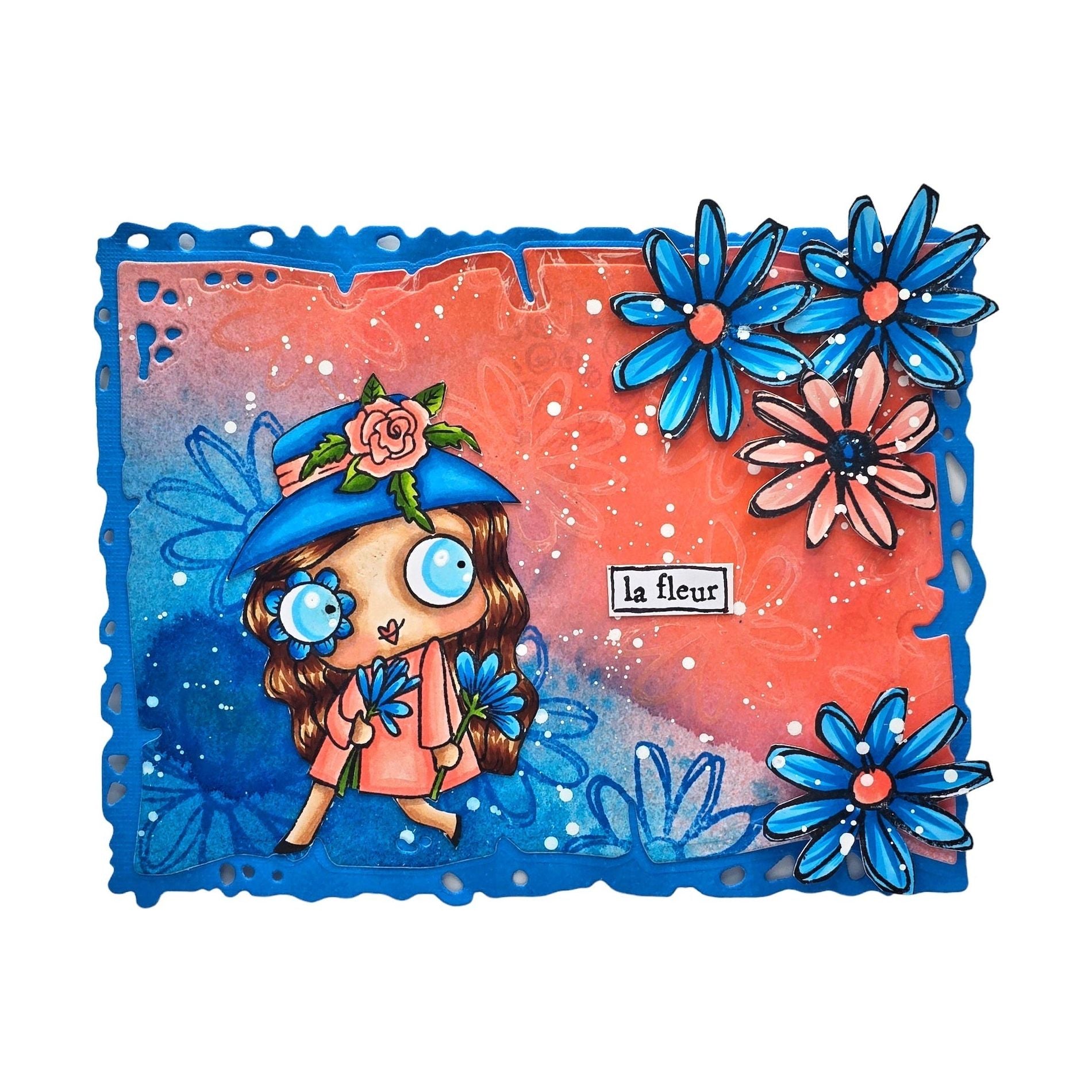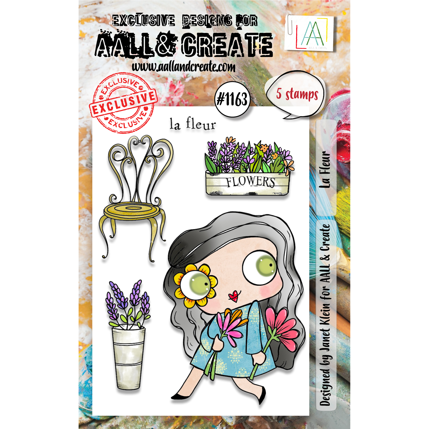 The AALL & Create La Fleur A7 Clear Stamps, designed by Janet Klein as part of the Spring Parade Collection, offer a delightful array of artistic elements perfect for adding charm to your crafting projects. Measuring 3 x 4 inches, these deeply etched photopolymer clear stamps consist of 5 crafted pieces that promise to inspire creativity. The focal point of the set is a whimsical illustration featuring a girl with a large flower eye, exuding a sense of playful whimsy as she holds flowers and gazes over her shoulder. In addition to the captivating central motif, the stamp set includes complementary elements such as an ornate chair, a box of flowers, and a vase brimming with blooms, providing versatility for various crafting applications. Accentuating the floral theme, the set also features the words "la fleur," adding a touch of elegance and sophistication to your creations.