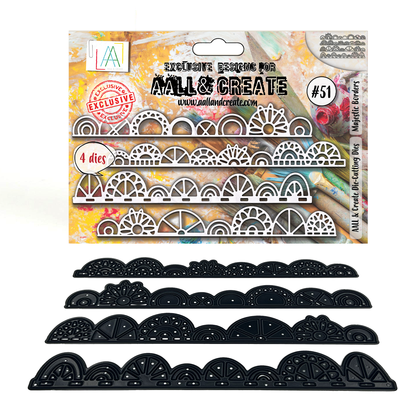 The AALL & Create Majestic Borders Dies, designed by Janet Klein, offer a collection of finely detailed, wafer-thin dies perfect for adding charming elements to your crafting projects. This set includes 4 dies ranging in size from approximately 5.5 x 0.75 inches (14cm x 1.9cm) to 5.5 x 0.6 inches (14cm x 1.5cm). The borders feature different styles of scallops with intricate designs in the arches. These dies are ideal for adding elegant and decorative edges to your projects.