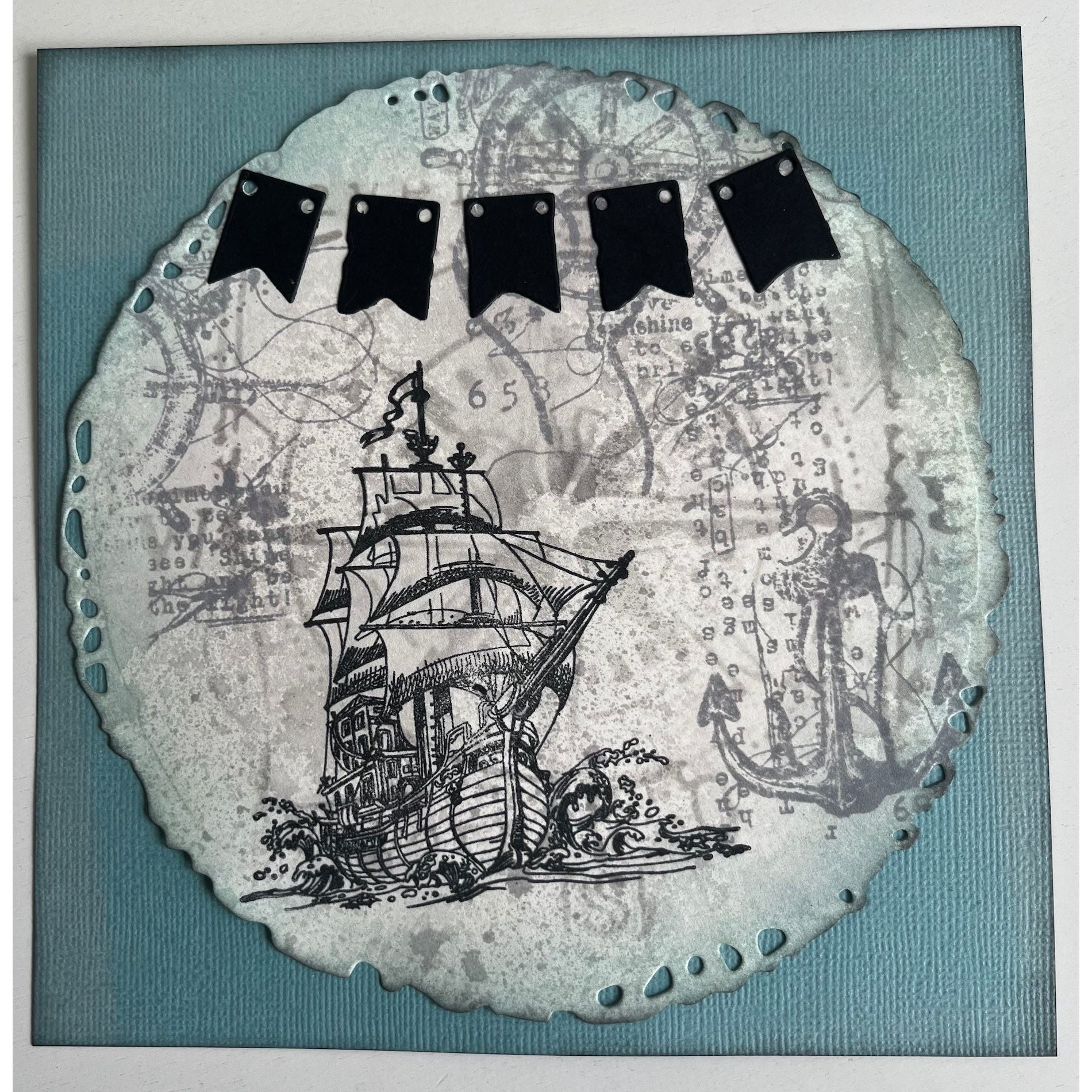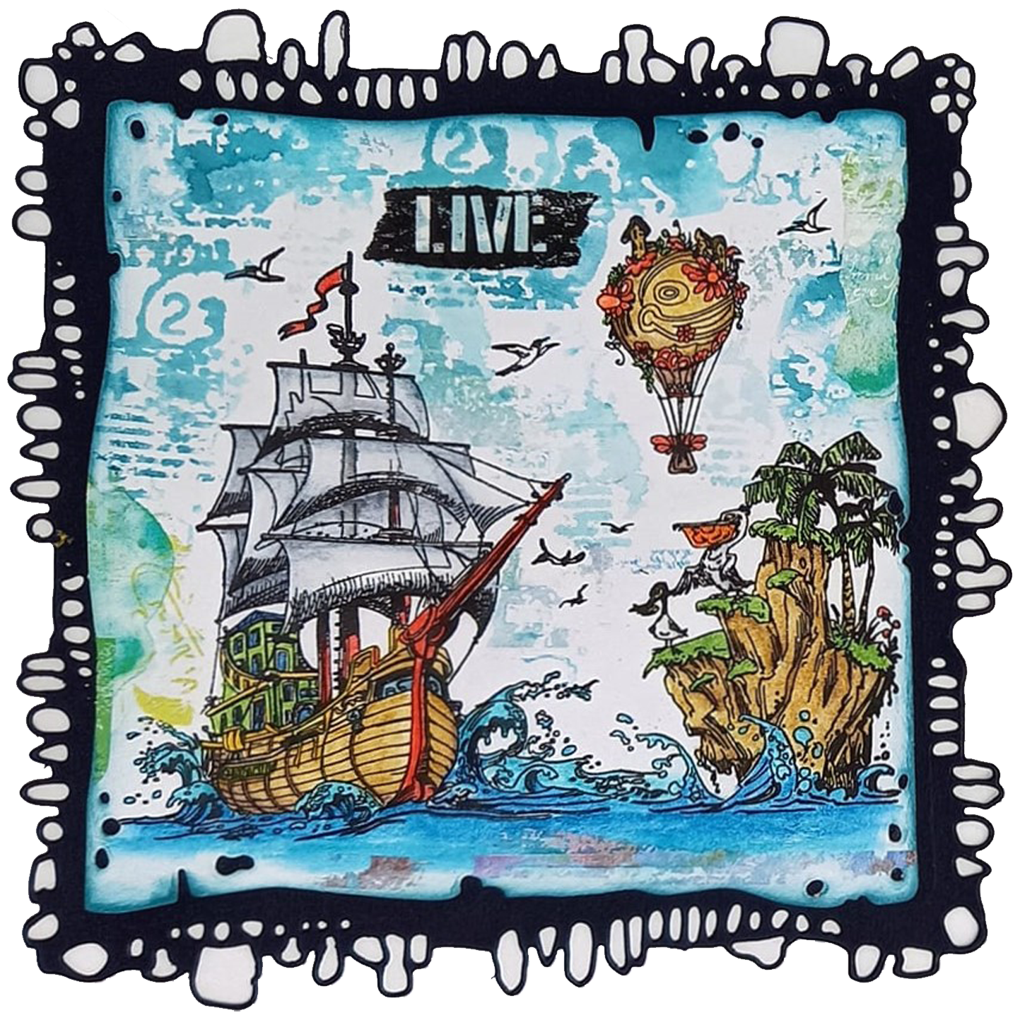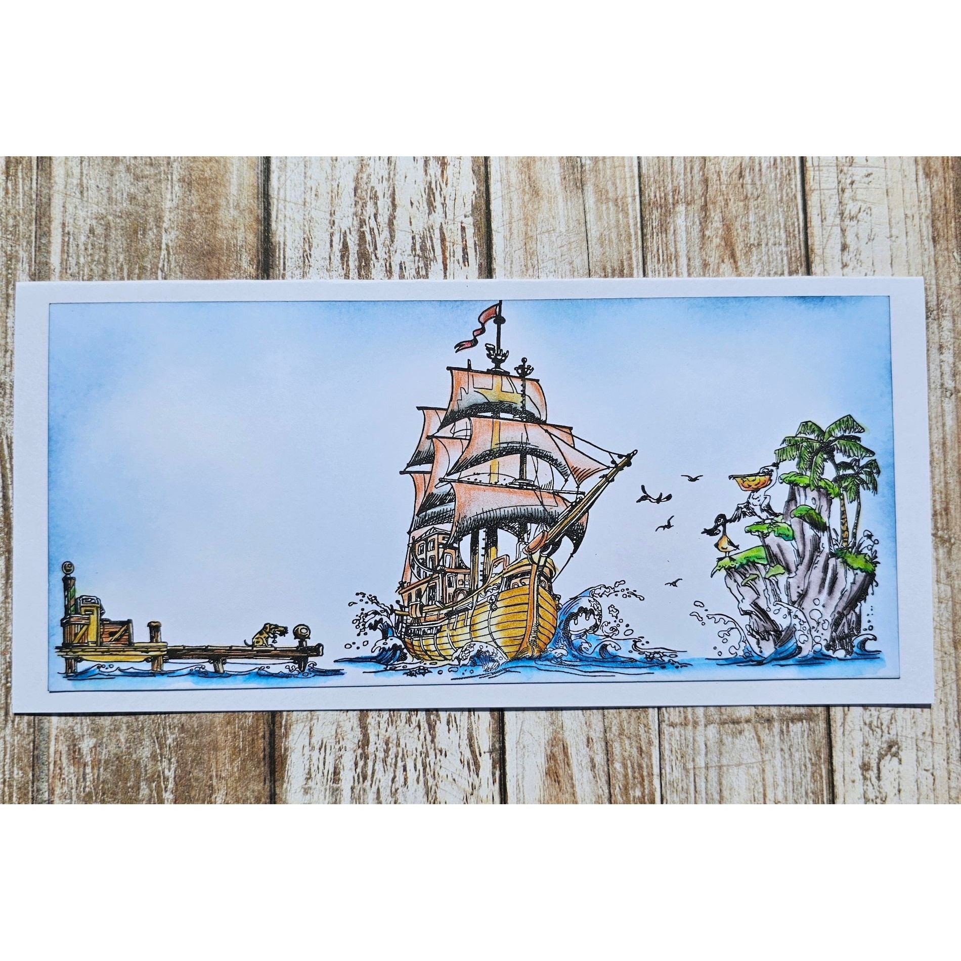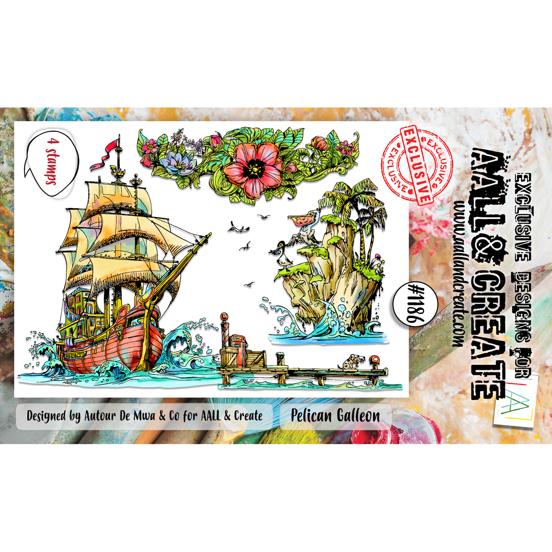 The AALL & Create Pelican Galleon A6 Clear Stamps, part of the Seaside Serenade Collection designed by Autour De Mwa & Co., offer a picturesque glimpse into maritime adventure and coastal beauty. Measuring 6 x 4 inches, this set of deeply etched photopolymer clear stamps comprises 4 pieces crafted to evoke the serene charm of the seaside. Among the designs is a majestic vintage ship, a galleon with its sails billowing high as it navigates the sparkling waves, accompanied by a quaint dock adorned with crates, a gas pump, and a friendly dog. In the background, a lofty island rises from the sea, crowned with graceful palm trees and populated by pelicans, while waves crash below and birds soar through the sky. Completing the scene is a border of delicate flowers, adding a touch of floral elegance to the coastal landscape.