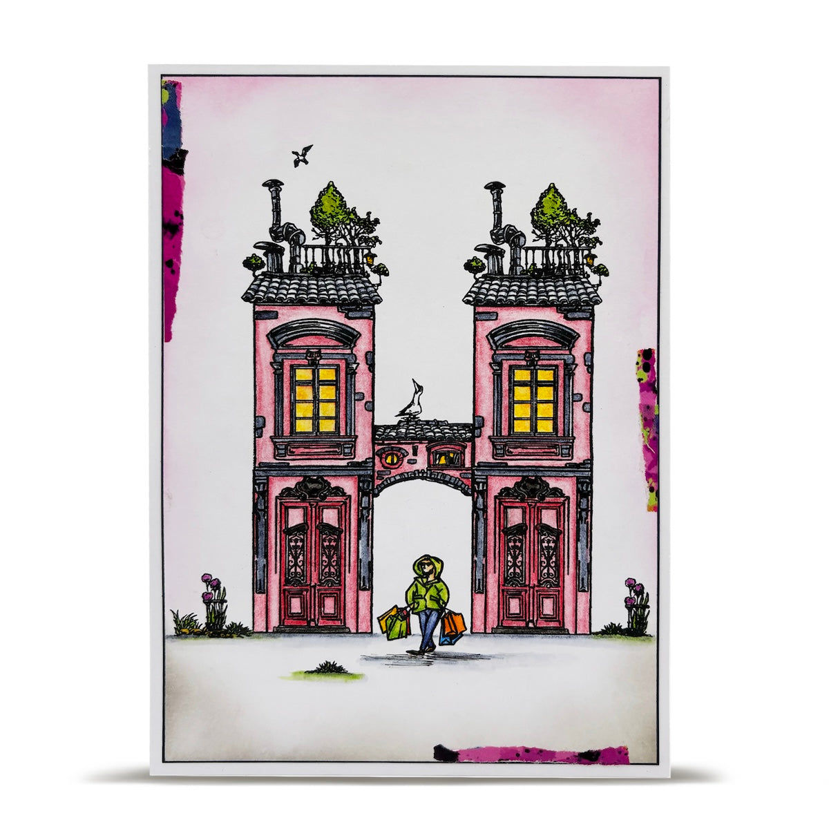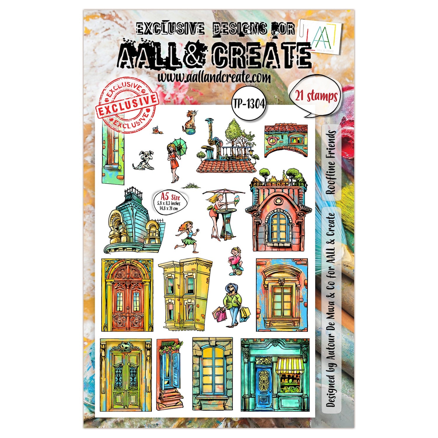 AALL & Create Roofline Friends A5 Clear Stamp Set was designed by Autour De Mwa & Co. for the AALLtropolis Collection. Measuring 6 x 8 inches, this set includes 21 deeply etched photopolymer stamps featuring mix-and-match elements such as building fronts, ornate doors, balconies, windows, rooftops, foliage, chimneys, and storefronts. It also includes lively characters—people shopping, running, and engaging in everyday activities—plus a cat and a dog. Perfect for building vibrant, personalized urban scenes. Use this set to build your own scene or expand other stamps in the AALLtropolis collection.