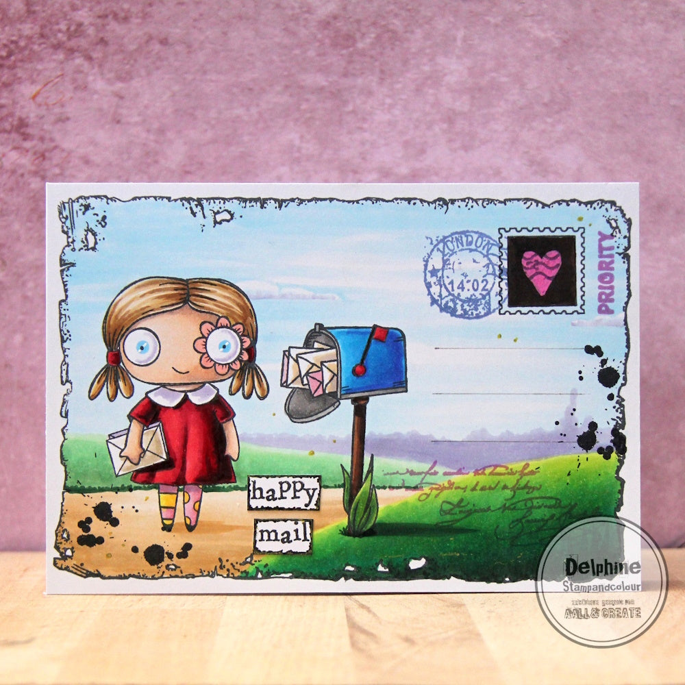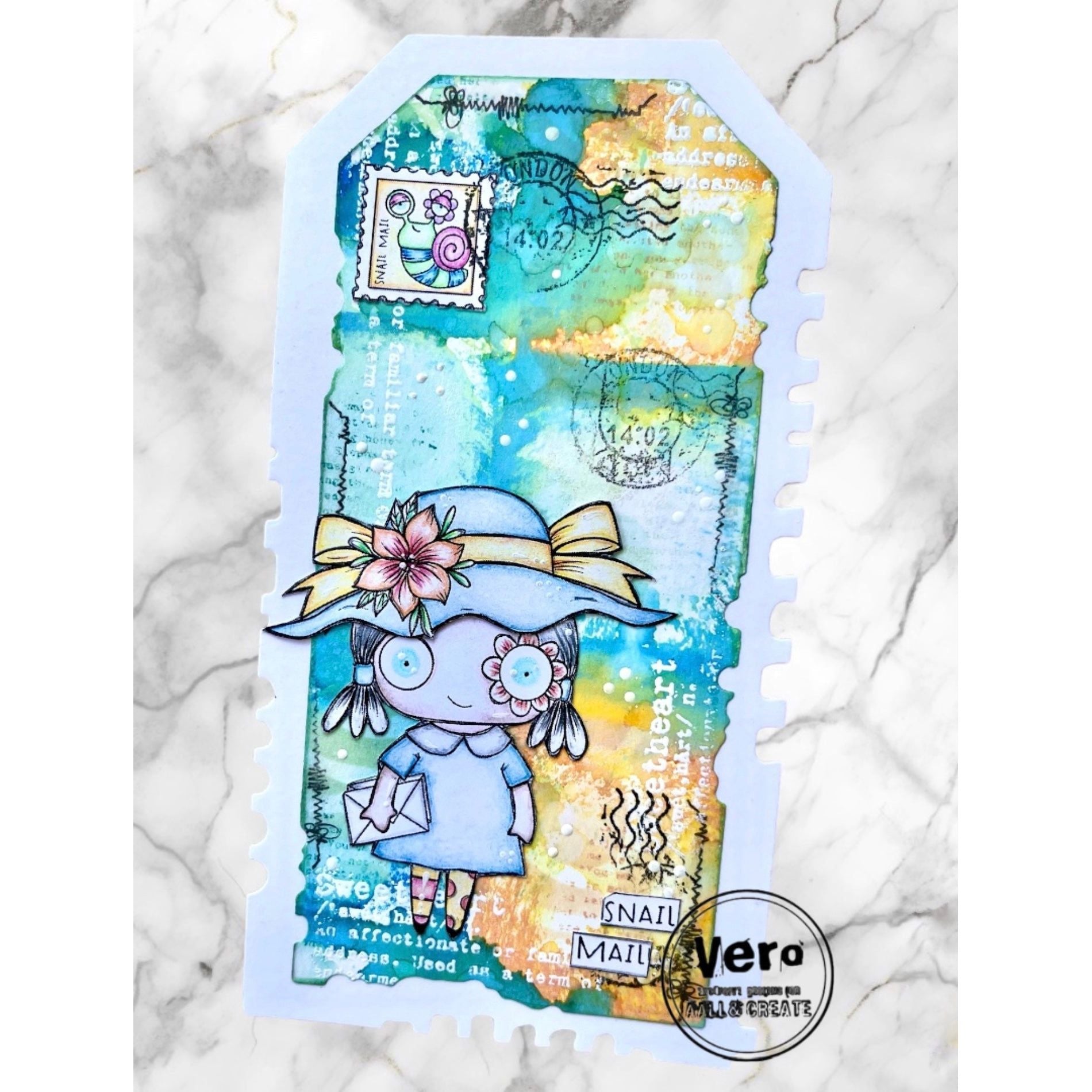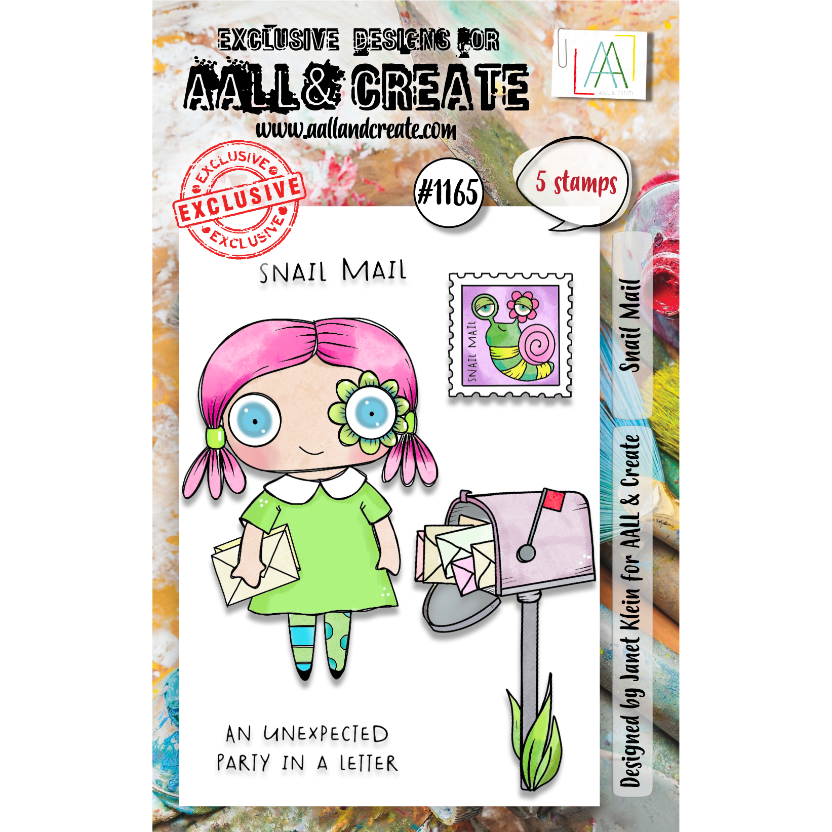 The AALL & Create Snail Mail A7 Clear Stamps, designed by Janet Klein as part of the Spring Parade Collection, offer a delightful array of imagery to enhance your creative projects. Measuring 3 x 4 inches, these deeply etched photopolymer clear stamps feature 5 intricately designed pieces that evoke a sense of whimsy and nostalgia. At the heart of the set is an endearing illustration of a girl adorned with a large flower eye, dressed in a collared dress and holding a stack of envelopes—a charming embodiment of the joy of sending and receiving mail. Accompanying the central motif, the stamp set includes a quaint mailbox overflowing with letters, a postage stamp adorned with a whimsical snail illustration, and the words "snail mail" and "An unexpected party in a letter," adding a touch of sweetness and sentimentality to your projects.