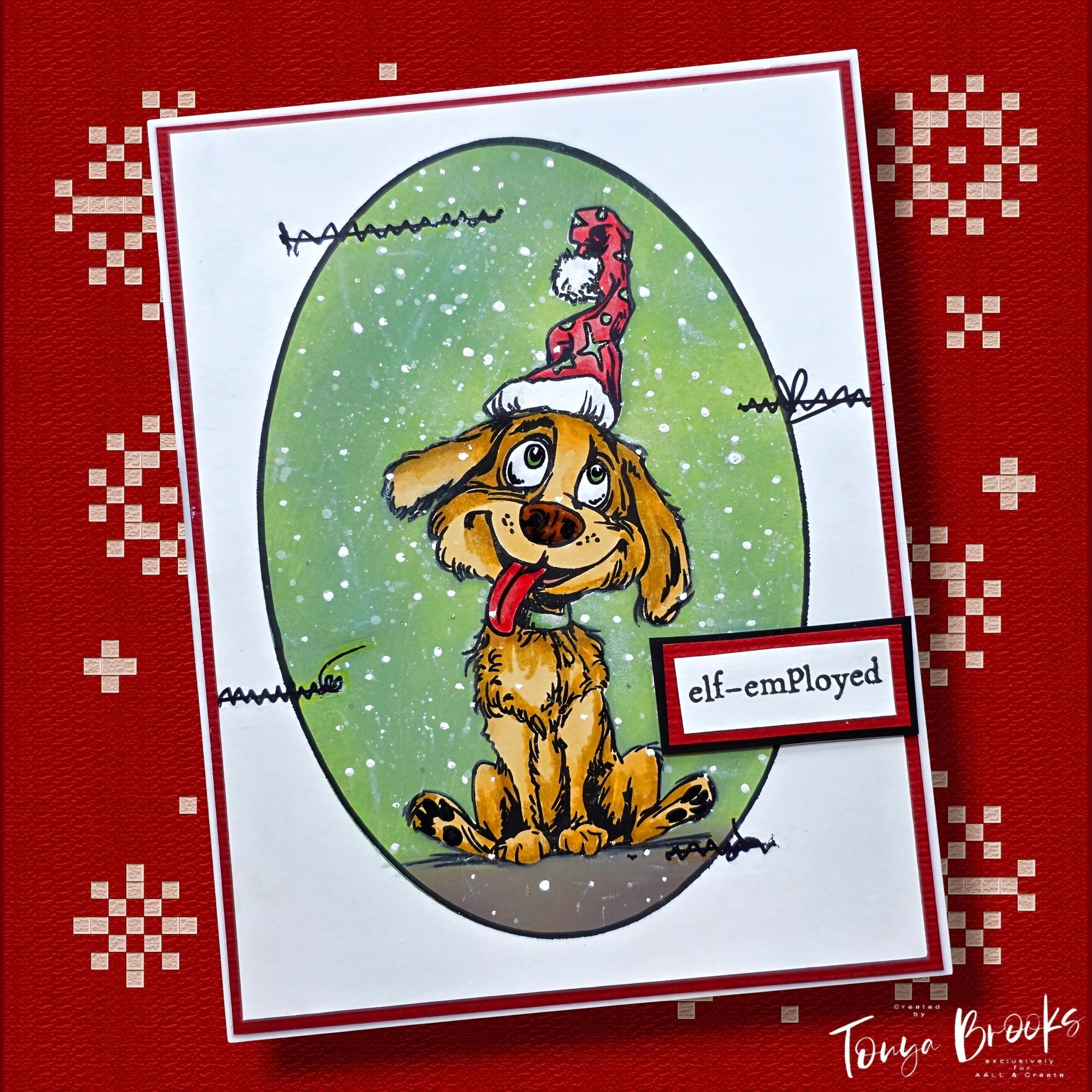 AALL & Create Snuggle Spark A6 Clear Stamps, designed by Autour De Mwa & Co. for the Santa’s Sidekicks Collection, measures 4 x 6 inches and includes six deeply etched photopolymer stamps. Designs feature playful dogs dressed with Santa hats, bells, bows, ornaments, or holly, along with an extra Santa hat and a mouse band leader.