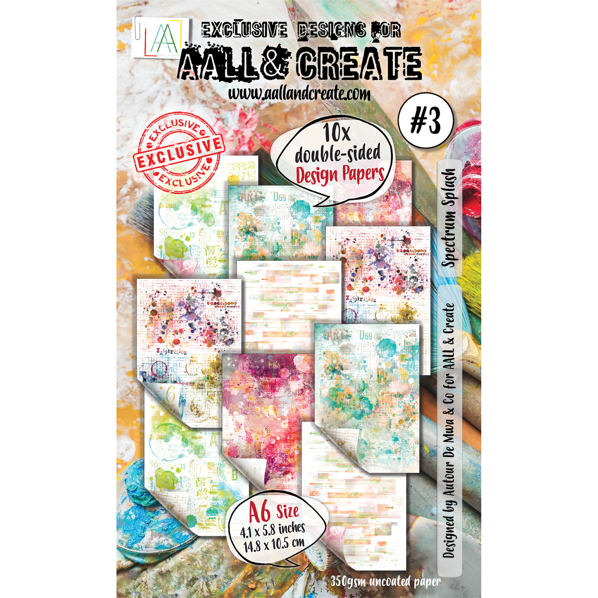 AALL & Create Spectrum SplashA6 Design Paper, crafted by Autour De Mwa & Co, offers a captivating array of unique designs and patterns that are sure to inspire creativity in all your paper-crafting endeavors. Each pack contains 10 double-sided sheets of high-quality heavyweight paper, with a substantial weight of 350gsm, ensuring durability and versatility in your projects. Measuring approximately 4.1 x 5.8 inches, these A6-sized sheets are perfectly sized for a wide range of crafting applications, from card making to scrapbooking and beyond. The designs featured in the collection are characterized by their bold and dynamic aesthetic, incorporating collages of grids, paint spills and drips, numbers, and more. The vibrant color palette, consisting of blues, greens, yellows, purples and reds, adds a lively and energetic touch to your creations, making them stand out with visual impact.