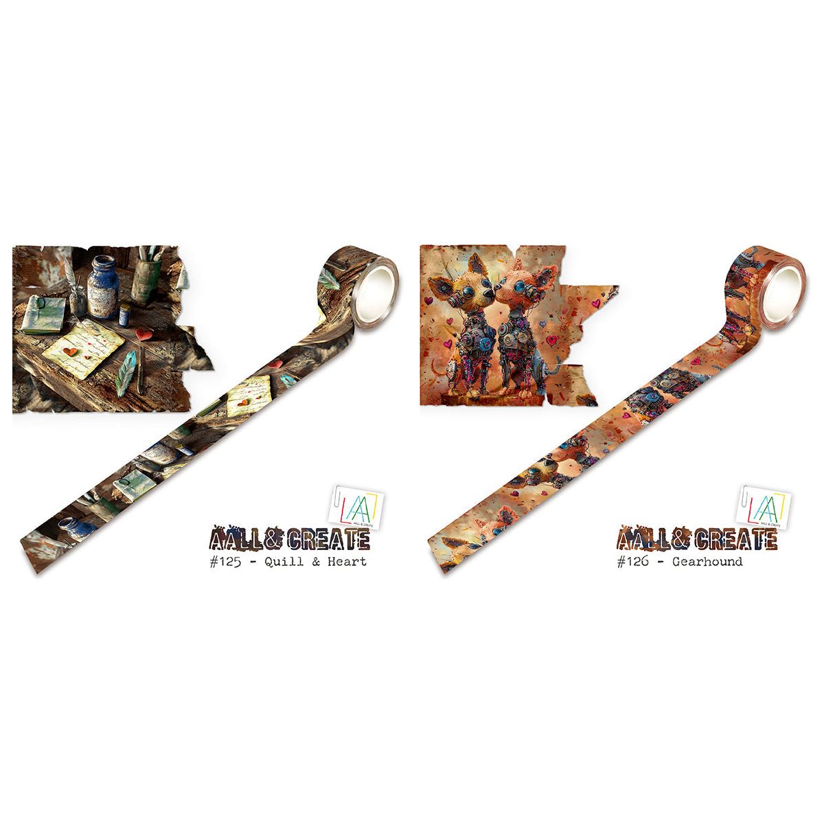 • Gearhound Layer it Up Washi Tape 126: 25mm wide and 10m long, showcasing steampunk mechanical dogs, ideal for adding a whimsical and unique touch to your creations.