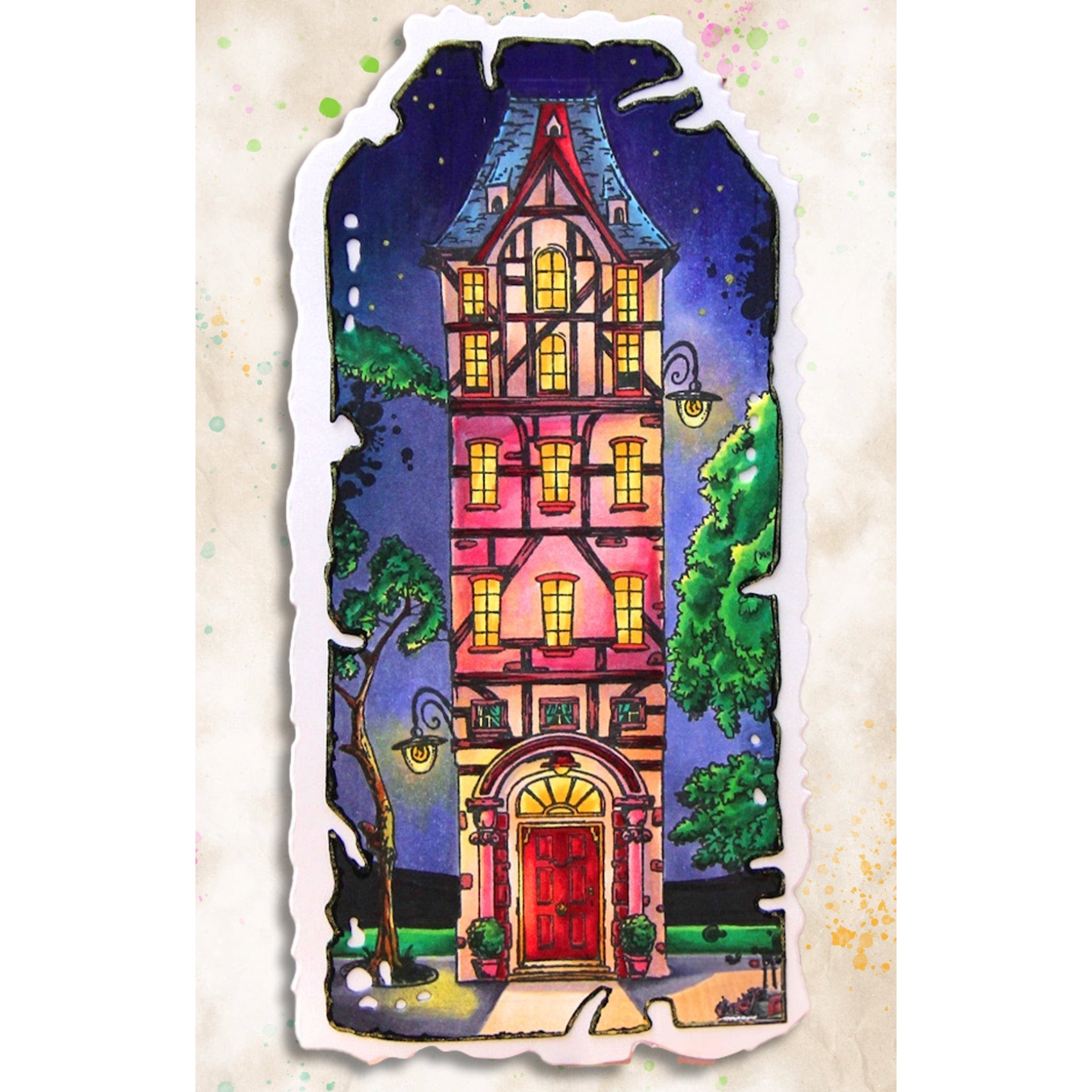 The AALL & Create Tudor Cottage A6 Clear Stamp Set was designed by Autour De Mwa & Co. for the Metamorphtropolis Collection. Measuring 6 x 4 inches, this set of deeply etched photopolymer clear stamps features 14 pieces. It includes various building scenes with windows, doors, and rooftops that can be interchanged, grouped, or layered. The set also comes with accessories such as fire escape ladders, birds, a cat and dog, a man with luggage, a bell, a lamppost, and a weather vane. This versatile set is perfect for creating detailed and charming urban scenes in your creative projects.