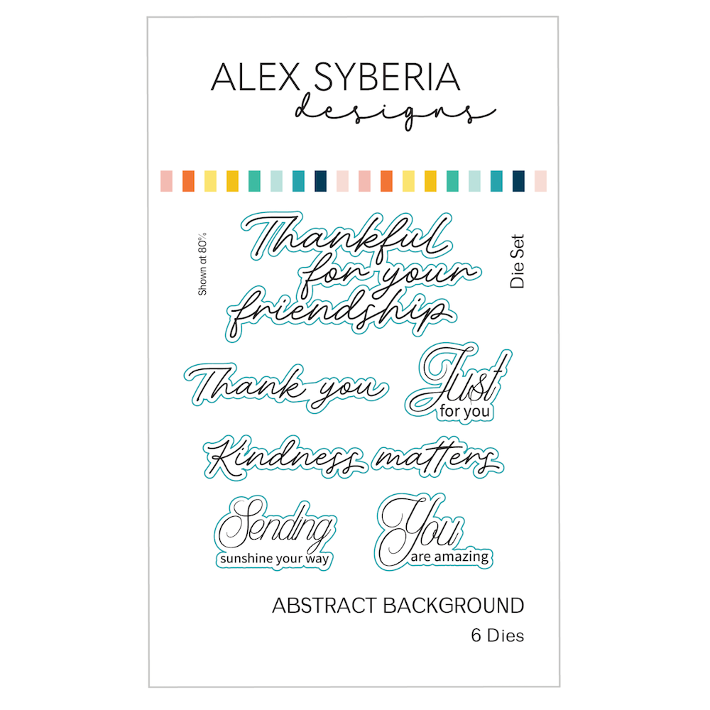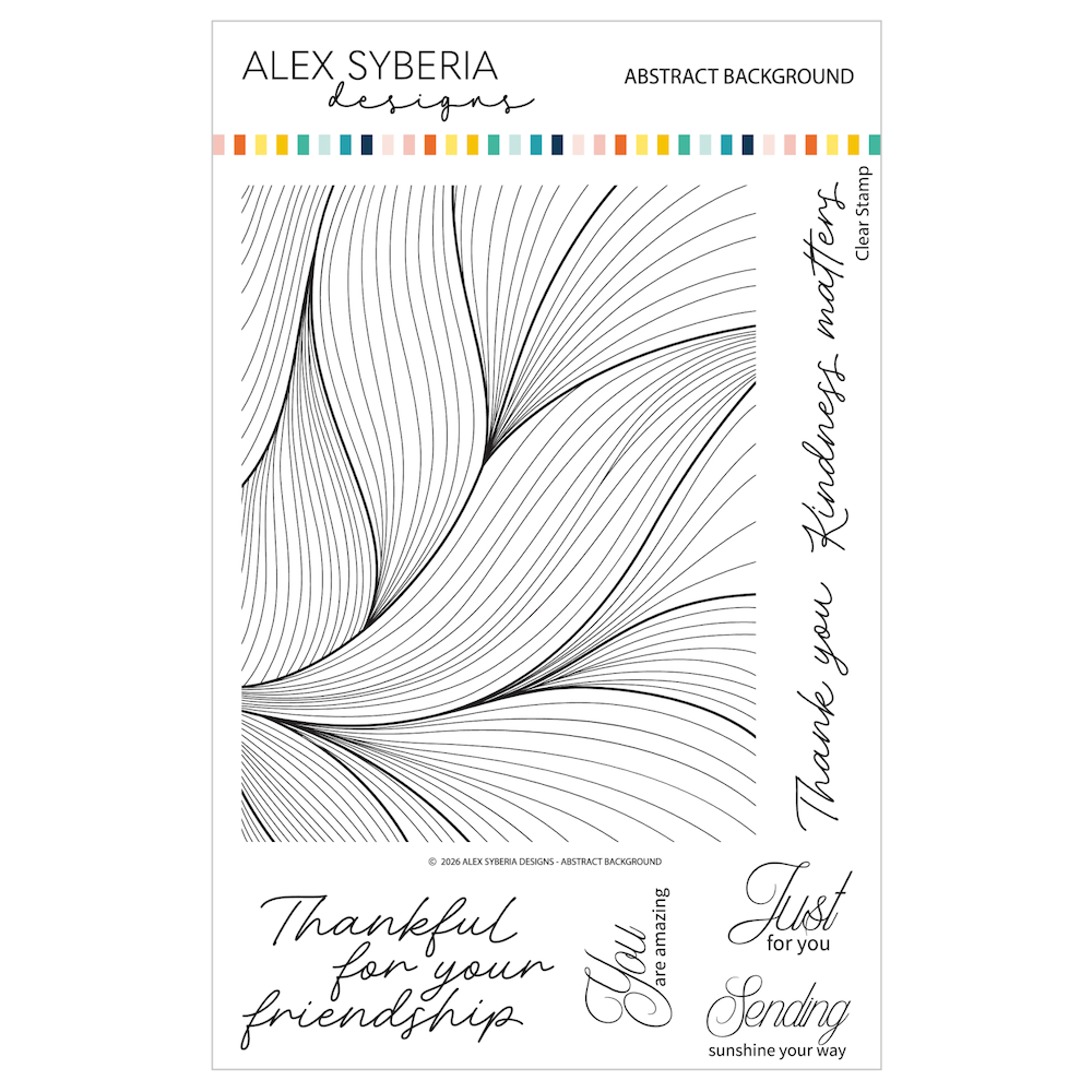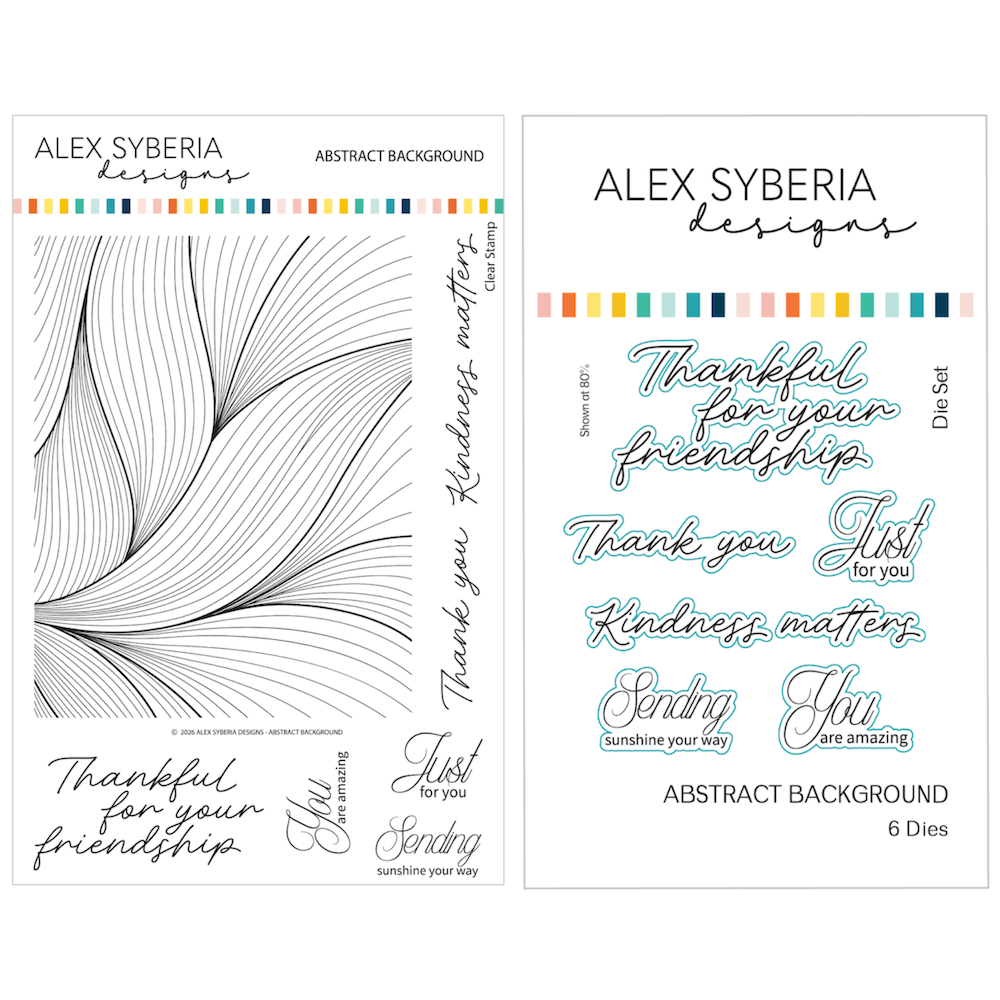 Alex Syberia Designs Abstract Background Stamp and Die Bundle brings modern movement and effortless elegance to your cardmaking. The 6 x 8 inch stamp set features a flowing abstract background sized to cover an A2 panel, along with six versatile sentiments for everyday occasions. The coordinating die set includes outline dies for each sentiment, giving you clean cuts, polished edges, and dimensional layers with ease. Perfect for adding stylish focal points or refined accents to cards, tags, and mixed-media projects.