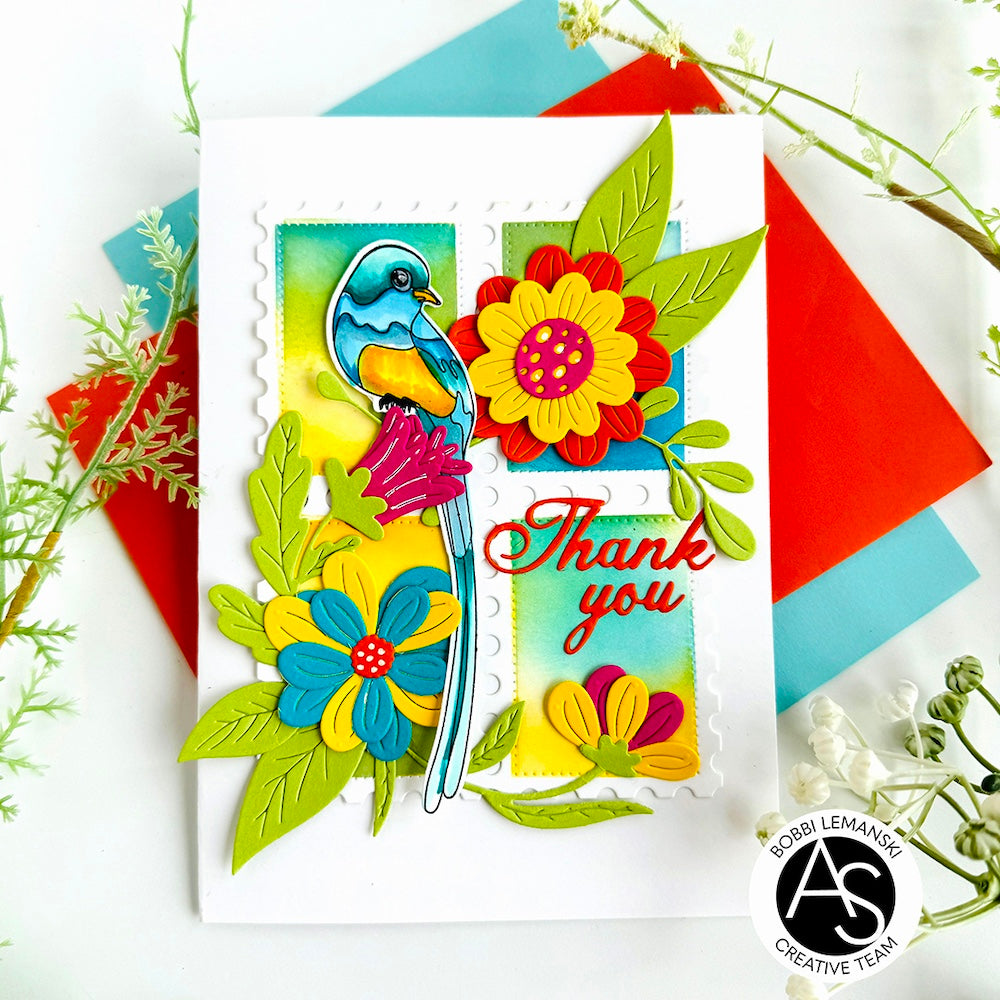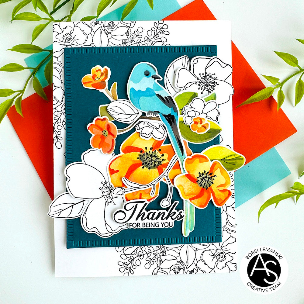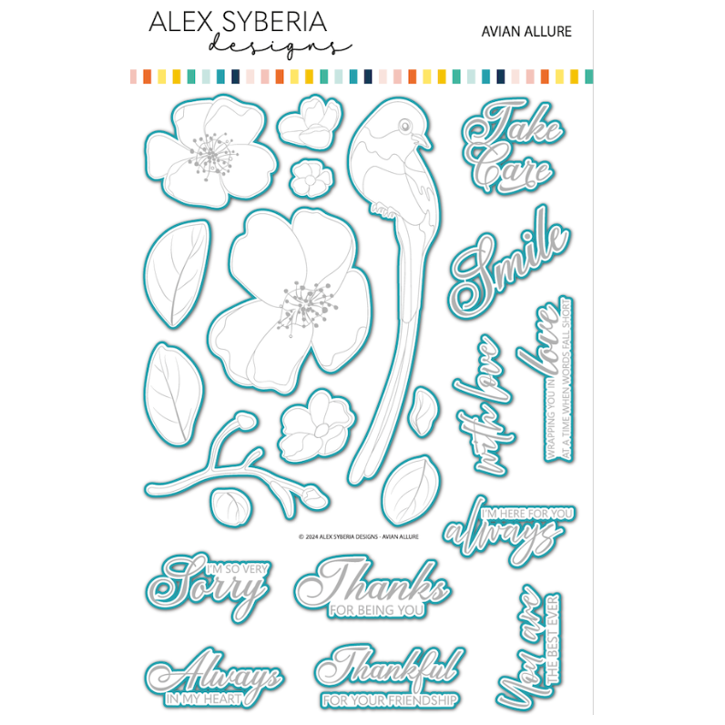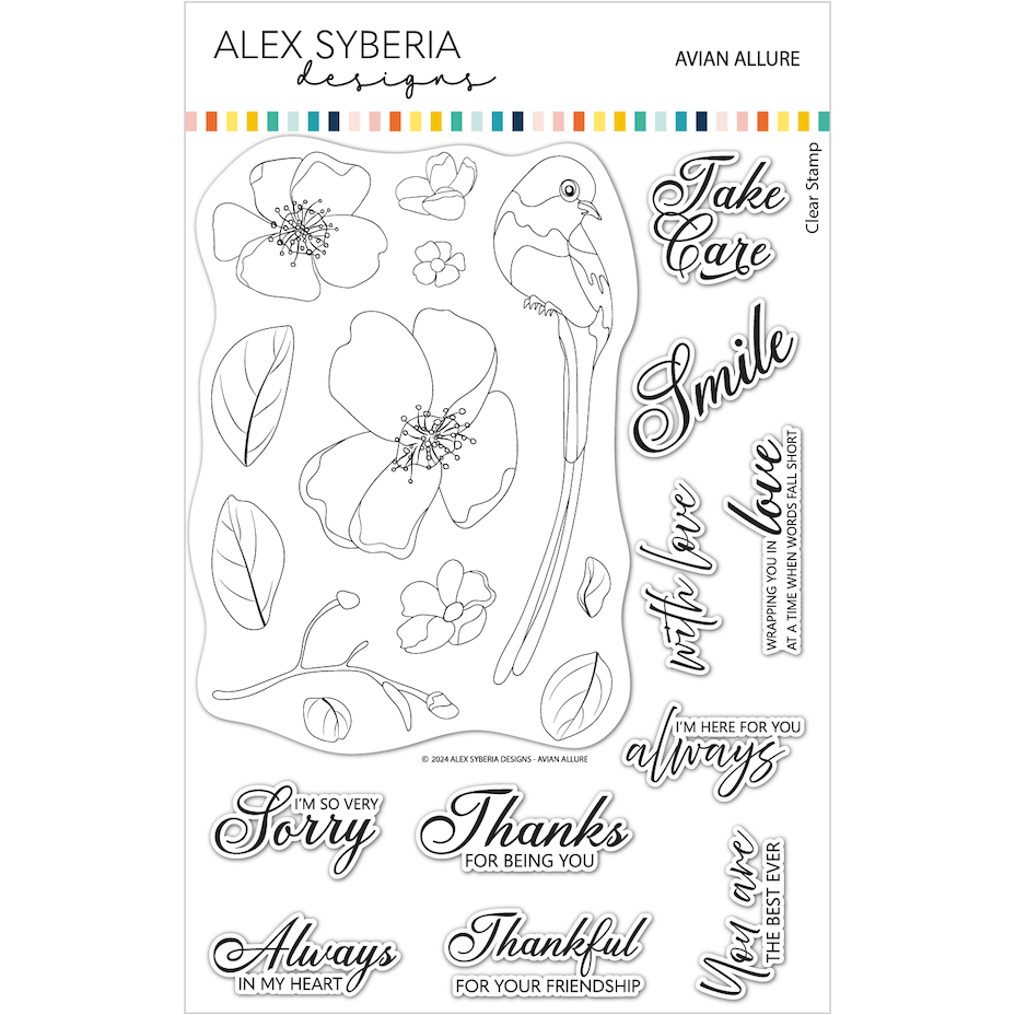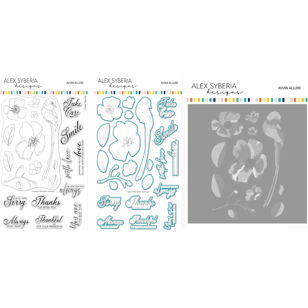 Streamline your crafting with the Alex Syberia Designs Avian Allure Bundle, which includes the Avian Allure Clear Stamp Set, Avian Allure Die Set, and Avian Allure Stencil Set. The 6 x 8 inch stamp set features a single stamp that beautifully captures a bird, branch, and flowers, allowing you to stamp all images at once for maximum efficiency. With included gorgeous sentiments like,