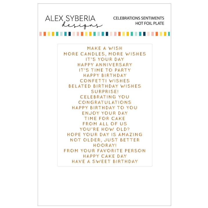 The Celebrations Sentiments Hot Foil Plate by Alex Syberia Designs is a fantastic collection of essential phrases for birthdays, anniversaries, and joyous occasions. This robust hot foil plate features the below 22 sentiments: