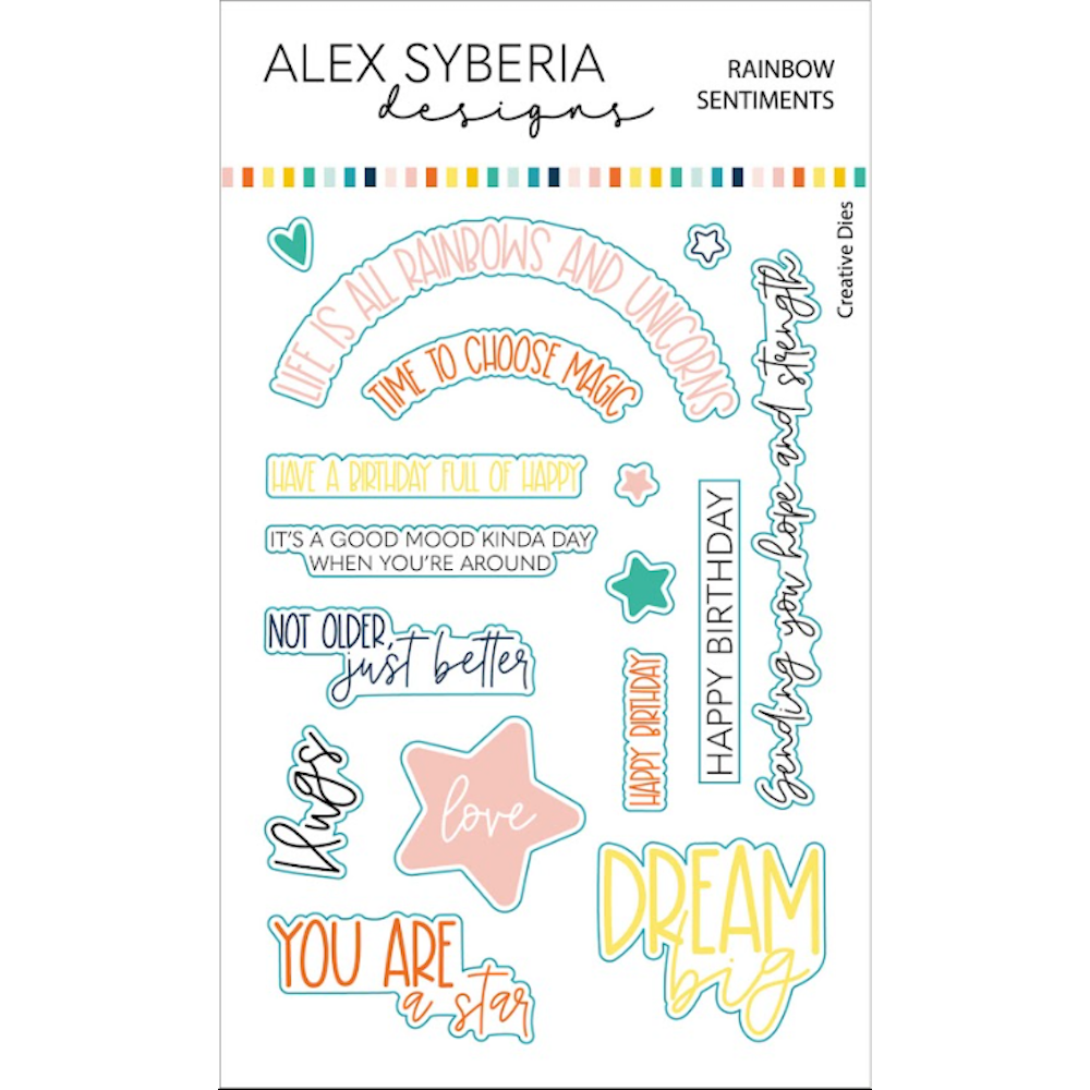 Introducing the Alex Syberia Designs Rainbow Sentiments Die Set, a colorful and high-quality collection of dies that is perfect for adding a touch of positivity and cheer to your paper crafting projects. This 16 piece die set coordinates with Rainbow Sentiments Stamp Set.