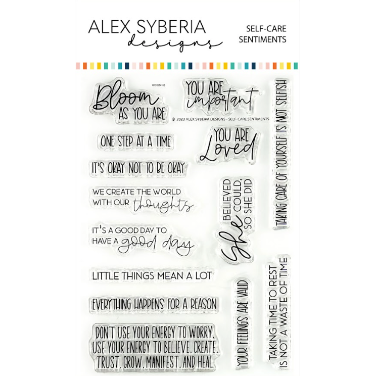 Introducing the Self-Care Sentiments Clear Stamp Set from Alex Syberia Designs. Crafted with care for mental health-themed projects, it's ideal for cardmaking, scrapbooking layouts, tags, or spreading love and encouragement to your dear ones. This set boasts 14 stamps, each carrying a profound message. For added convenience, pair it effortlessly with the Self-Care Sentiments Die Set for swift cutting. Share positivity and support with this versatile stamp set.