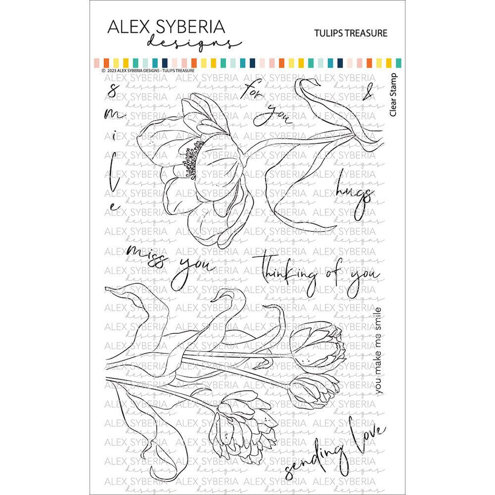 Introducing the Alex Syberia Designs Tulips Treasure Stamp Set, a delightful collection of stamps that will bring the beauty of blooming tulips to your projects. This 6 x 8 inch stamp set features two large images of tulips and a collection of positive sentiments, all designed in the exquisite and distinctive style that Alex Syberia Designs is known for. Sentiments include: