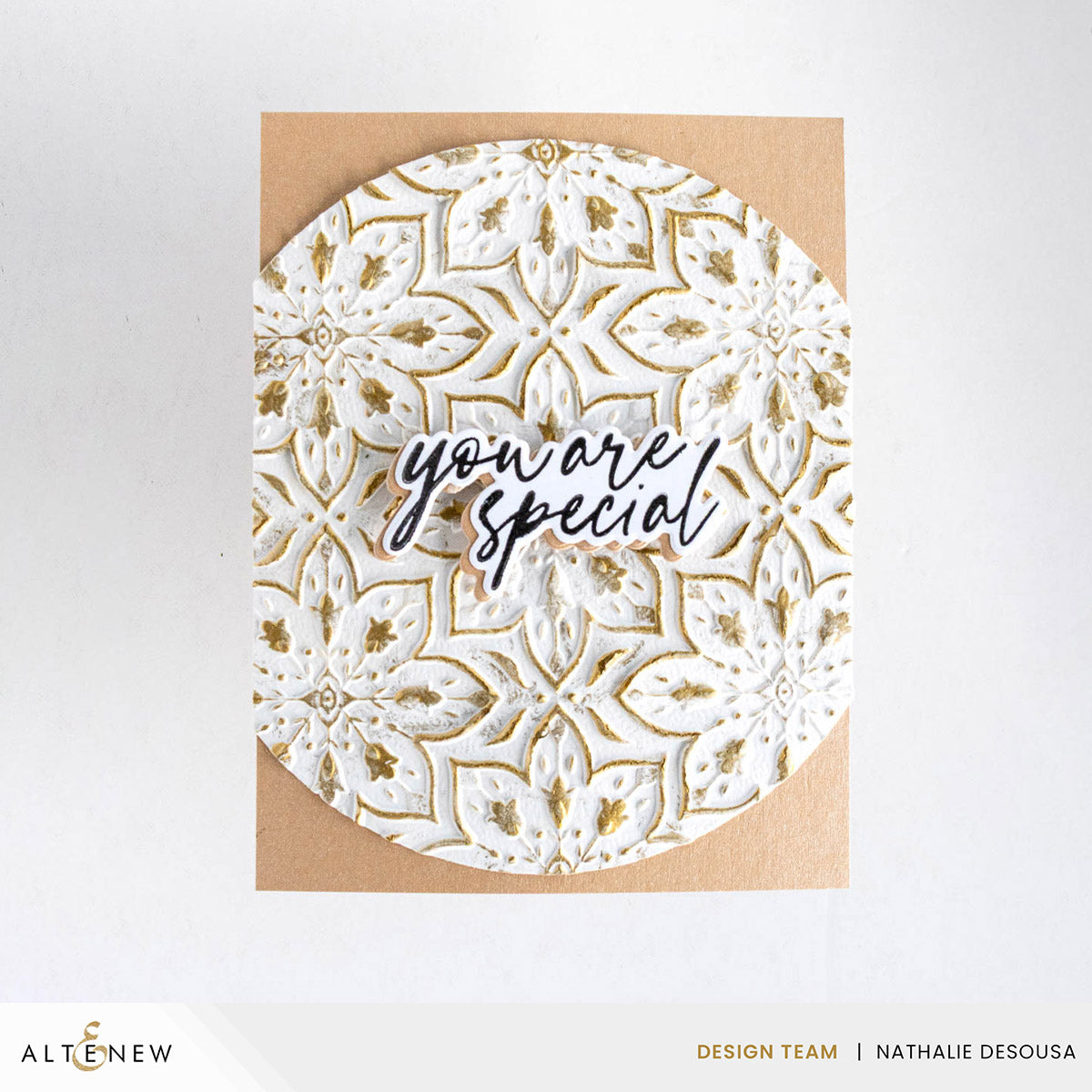 Inspired by the beauty of ornate tilework, the Altenew Blooming Doily Charm 3D Embossing Folder, which is 6 x 6 inches, showcases an elegant pattern of repeating emblems, mosaic details, and organic shapes. This richly textured design adds depth and charm to card fronts, journal pages, and mixed media projects with ease.