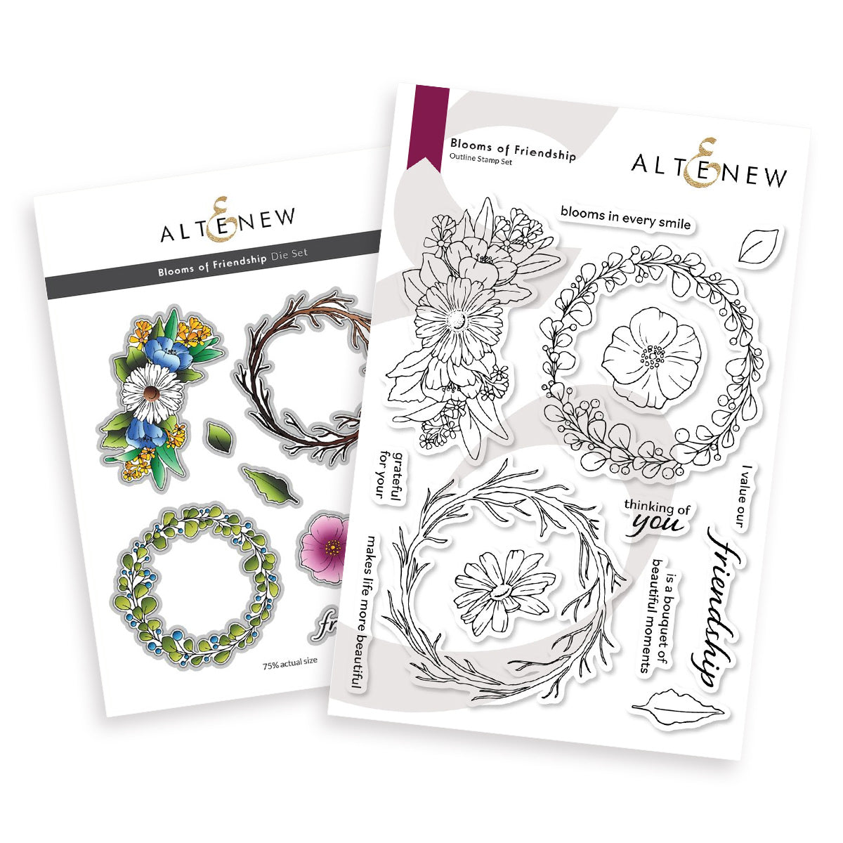 The Altenew Blooms of Friendship Clear Stamp and Die Set is the perfect combination for creating heartfelt, friendship-themed projects. The 6 x 8 inch stamp set ALT10049 features a variety of outline images, including branch and leafy wreaths, floral swags, and individual flowers and leaves that can be colored and customized to fit your style. Pair these stamps with the coordinating dies ALT10050 to easily cut out each element and add dimension to your handmade cards, scrapbook pages, and other DIY projects.