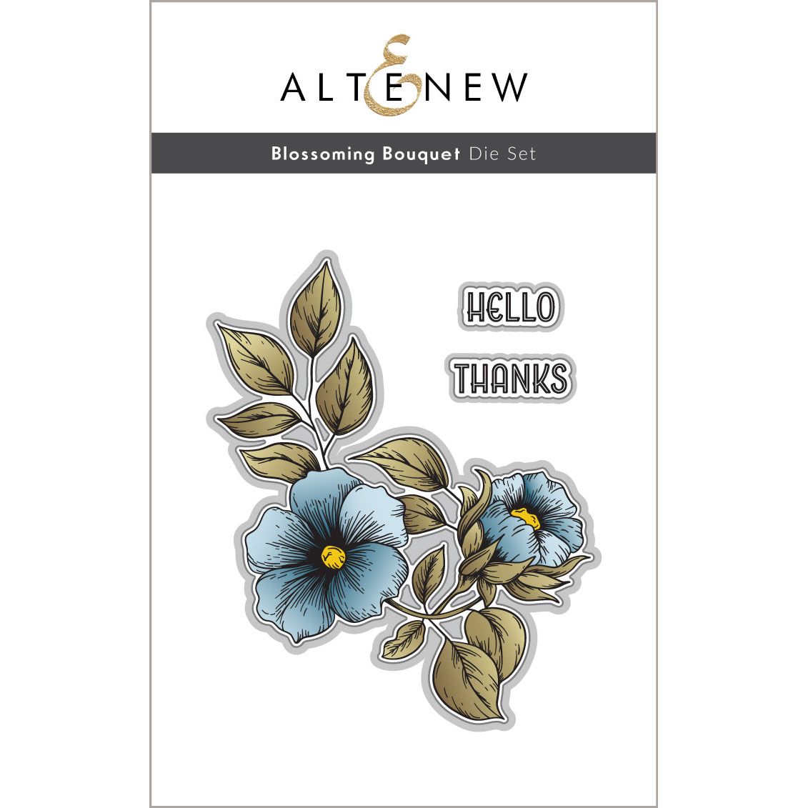 The coordinating Blossoming Bouquet Die Set includes dies for the pair of blooms in the press plate set and the sentiments hello and thanks.