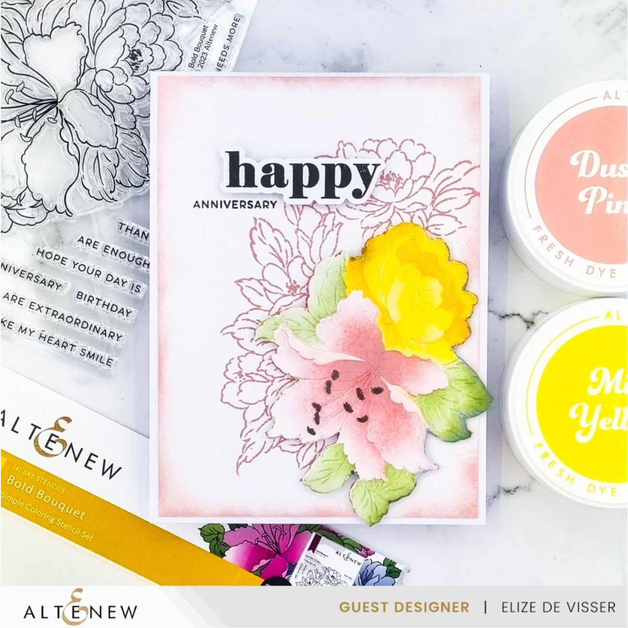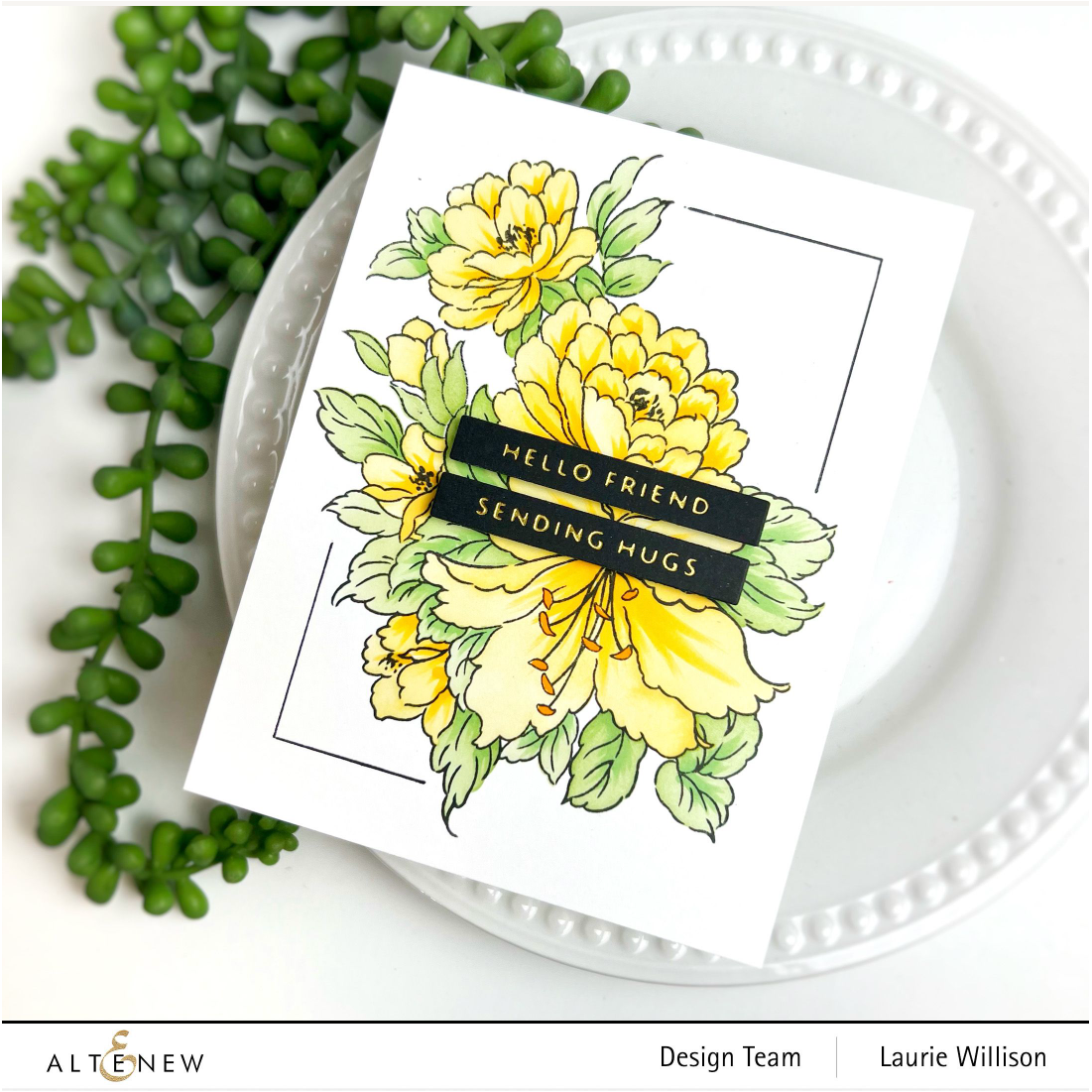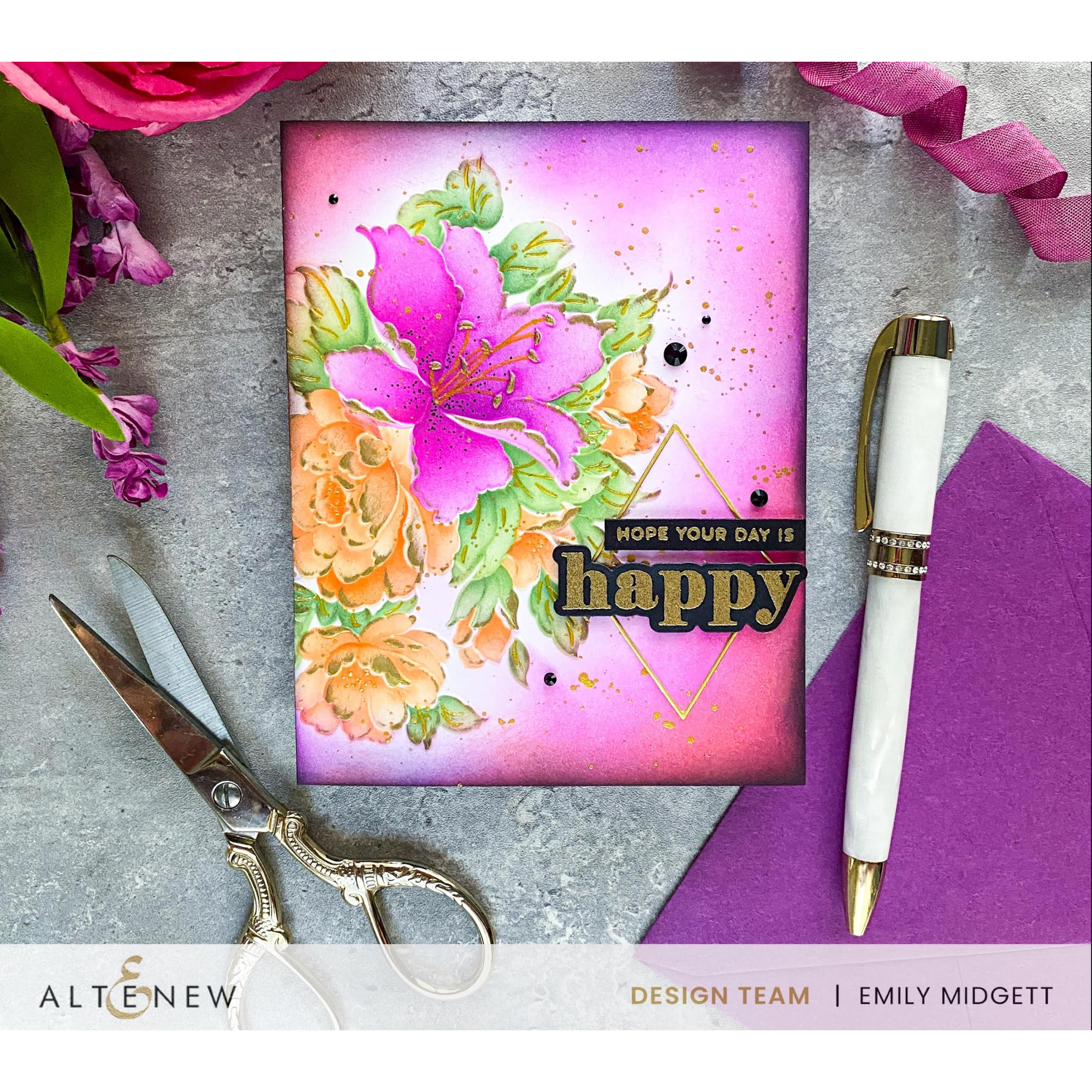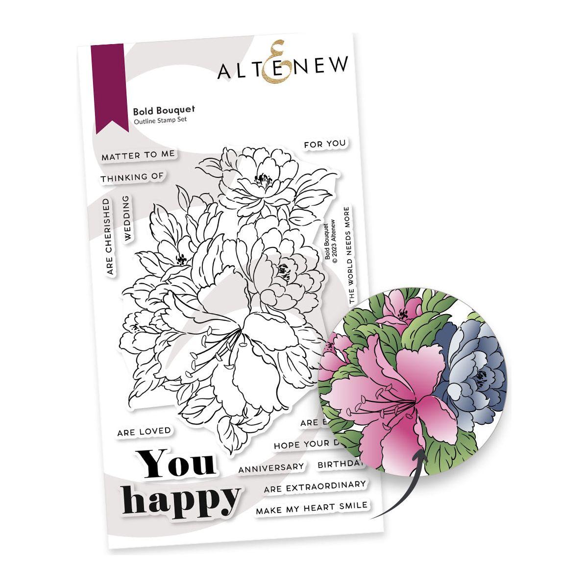 The Altenew Bold Bouquet Stamp Set offers a touch of floral elegance for your creative projects. This 4 x 6 inch set features a stunning floral arrangement created in a bold and expressive style. The centerpiece of the bouquet is a prominent lily surrounded by roses, camellias, and lush foliage. Additionally, the set includes two striking greetings and a collection of fifteen heartfelt sentiments to enhance your designs.