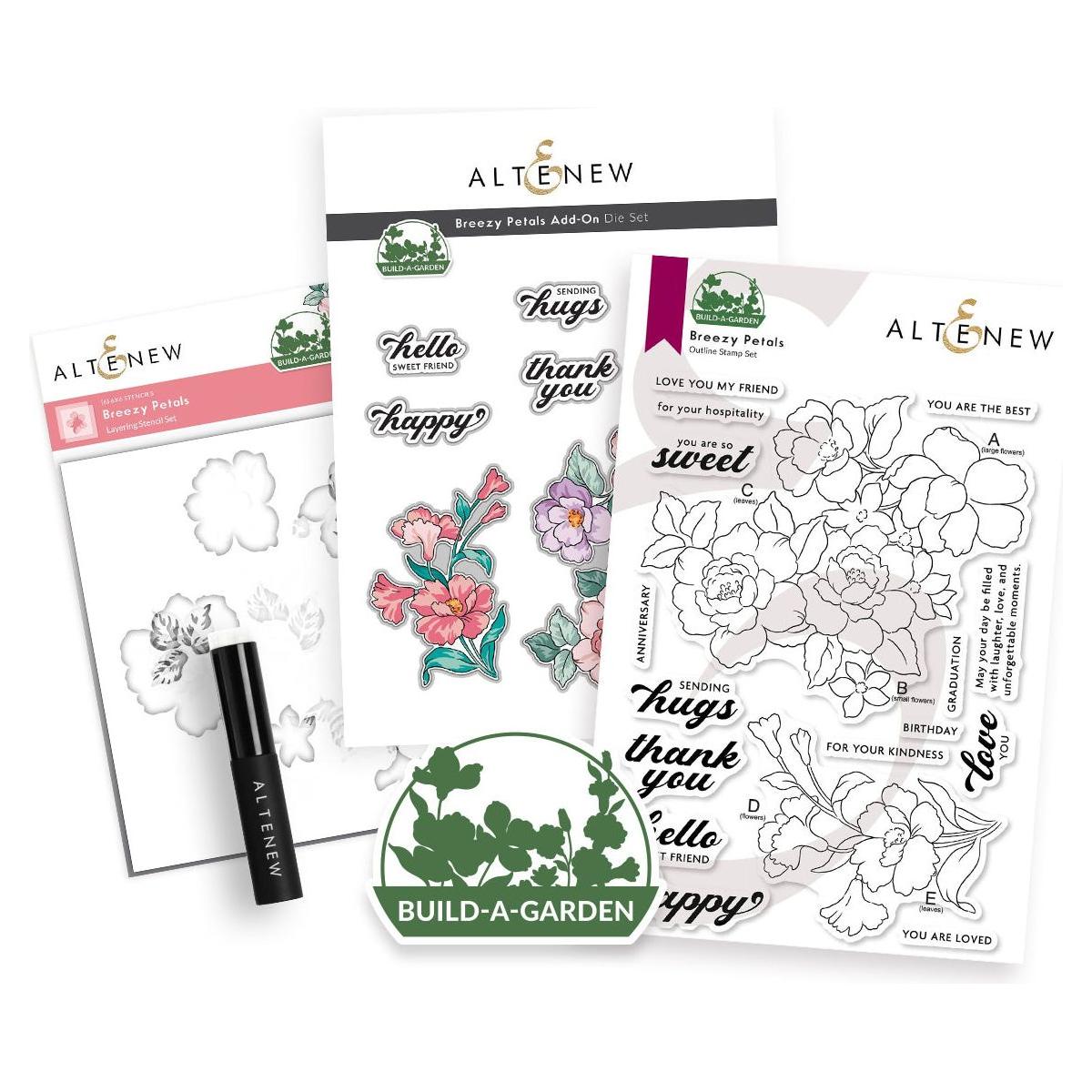 This bundle includes the Altenew Build-A-Garden: Breezy Petals Stamp, Stencil, and Add-On Die Set—a complete set to bring delicate, breezy floral designs to life.