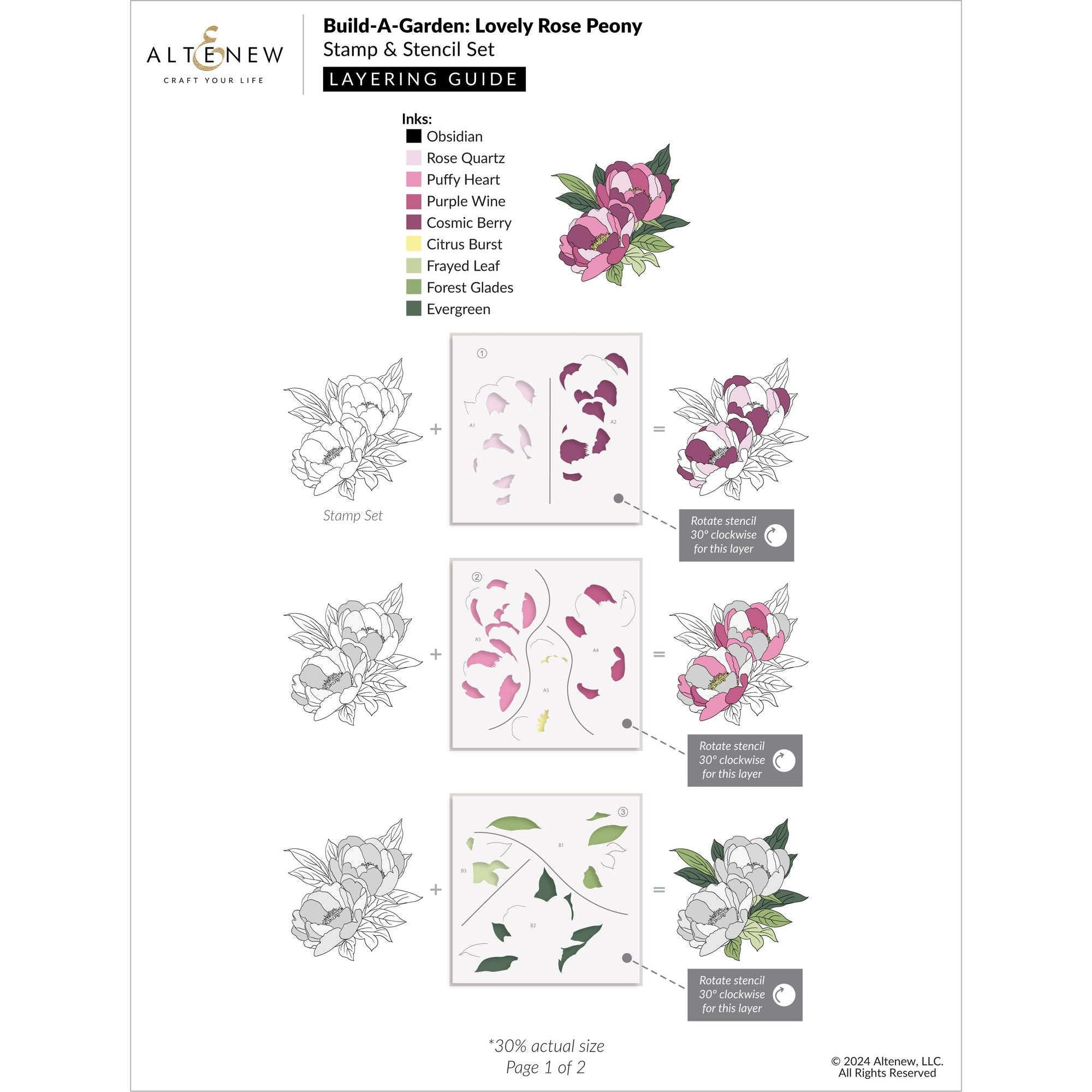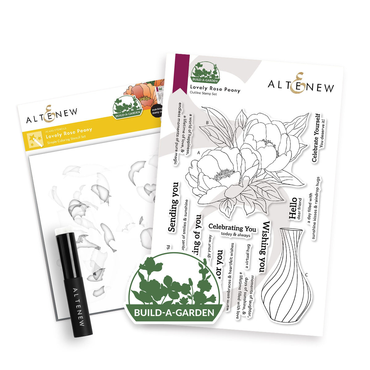 The Build-A-Garden: Lovely Rose Peony Layering Stencil Set adds colors to the peony arrangement and vase. Use your favorite Altenew inks and blending brushes to bring the images to life.