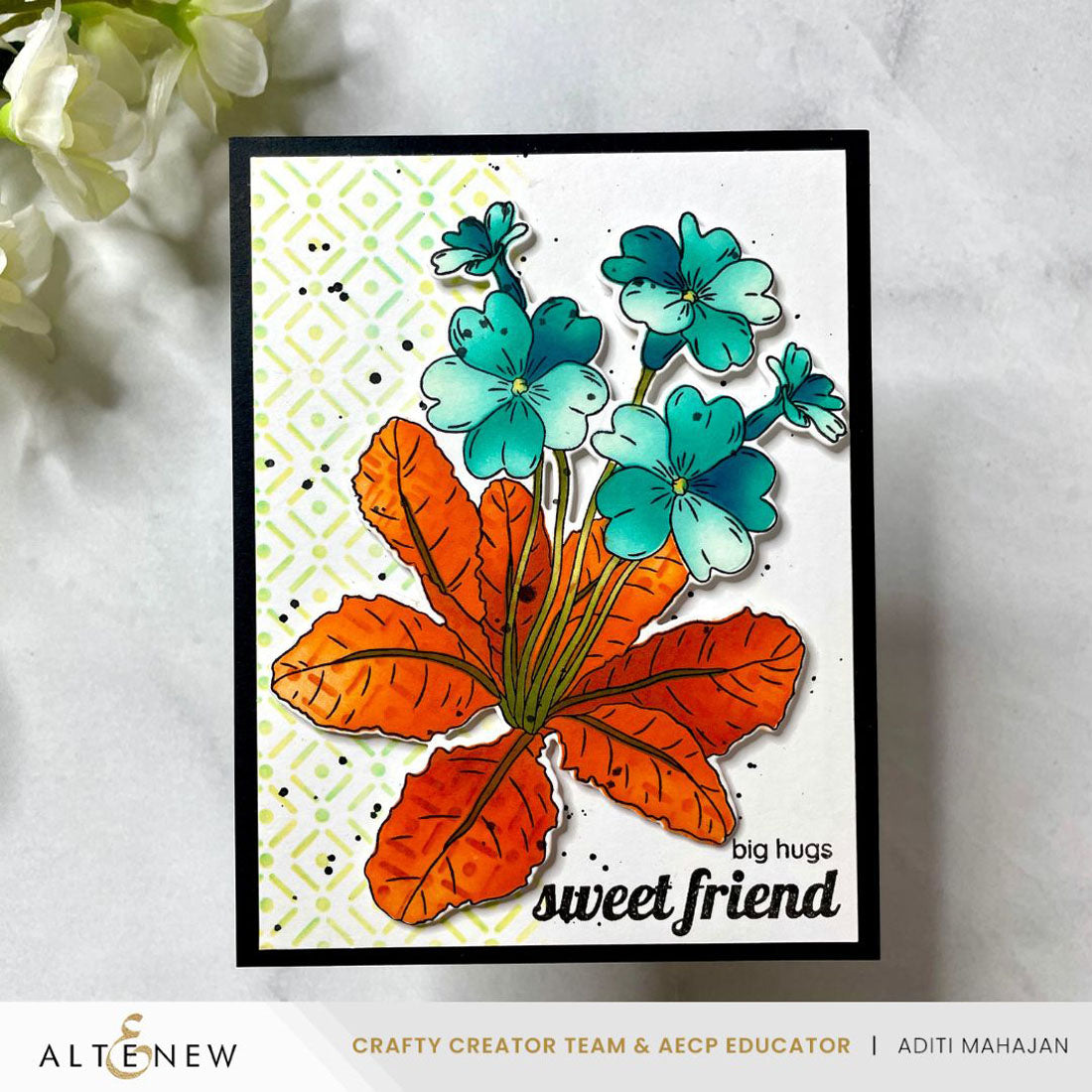 The Altenew Build-A-Garden: Primrose Set is a versatile and elegant collection featuring primrose flowers, symbolizing youth and everlasting love, perfect for adding beauty and meaning to your crafting projects. The set includes the following stamps, dies, and stencils that make it easy to create layered, professional designs. There is also a blending brush included!