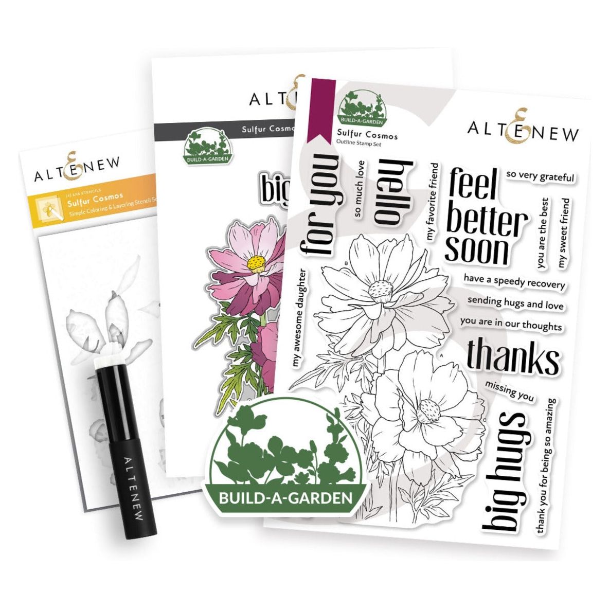This bundle includes the Build-A-Garden: Sulfur Cosmos Stamp Set, Add-On Die Set, Layering Stencil Set, and a Mini Blending Brush.