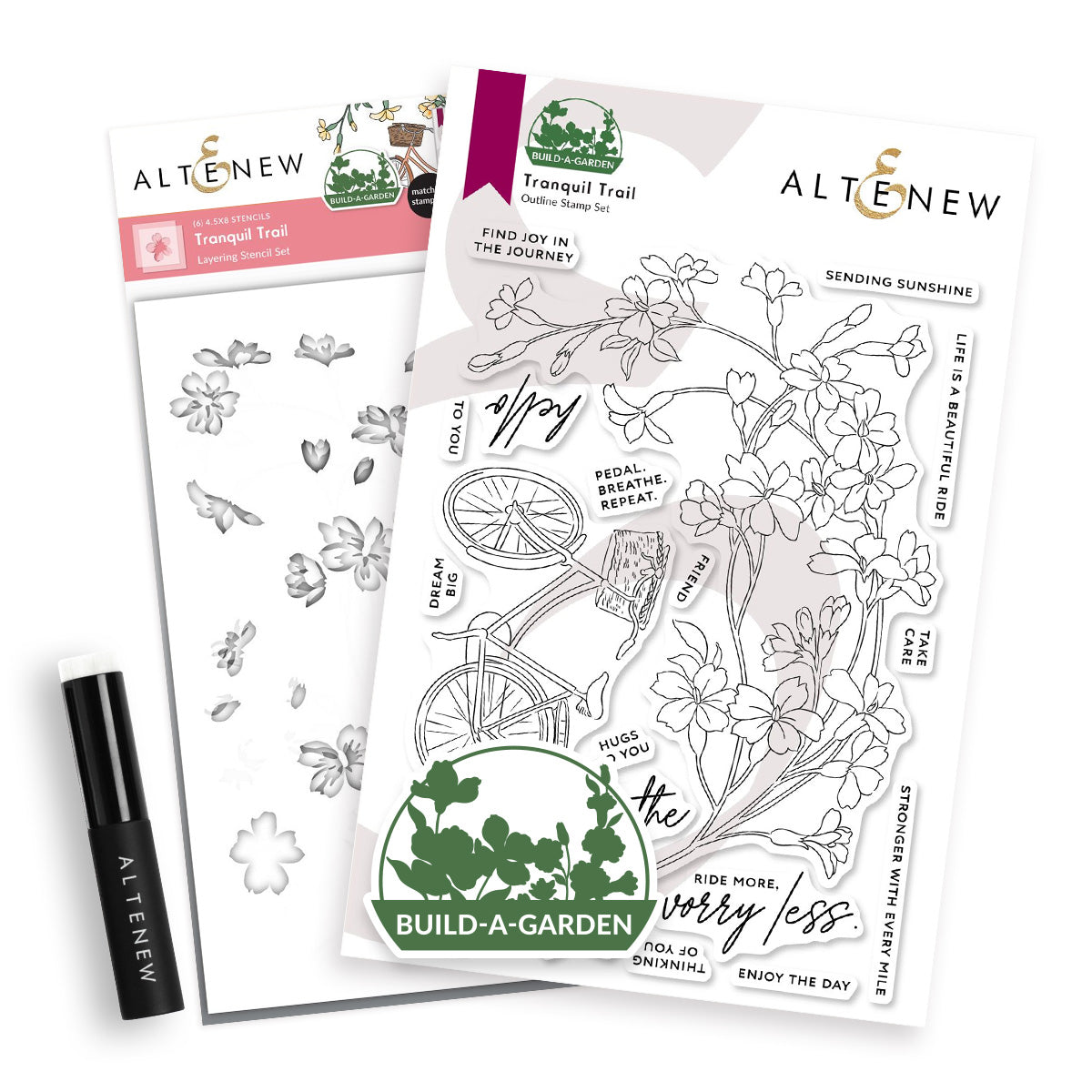 The Altenew Build-A-Garden: Tranquil Trail Set is a beautifully coordinated crafting bundle that includes everything you need to create serene, nature-inspired designs. This set features the 6 x 8 inch Tranquil Trail Clear Stamp Set, a 4.5 x 8 inch Layering Stencil Set of 6 stencils, and a Mini Blending Brush, all working together to bring elegant outdoor scenes to life.