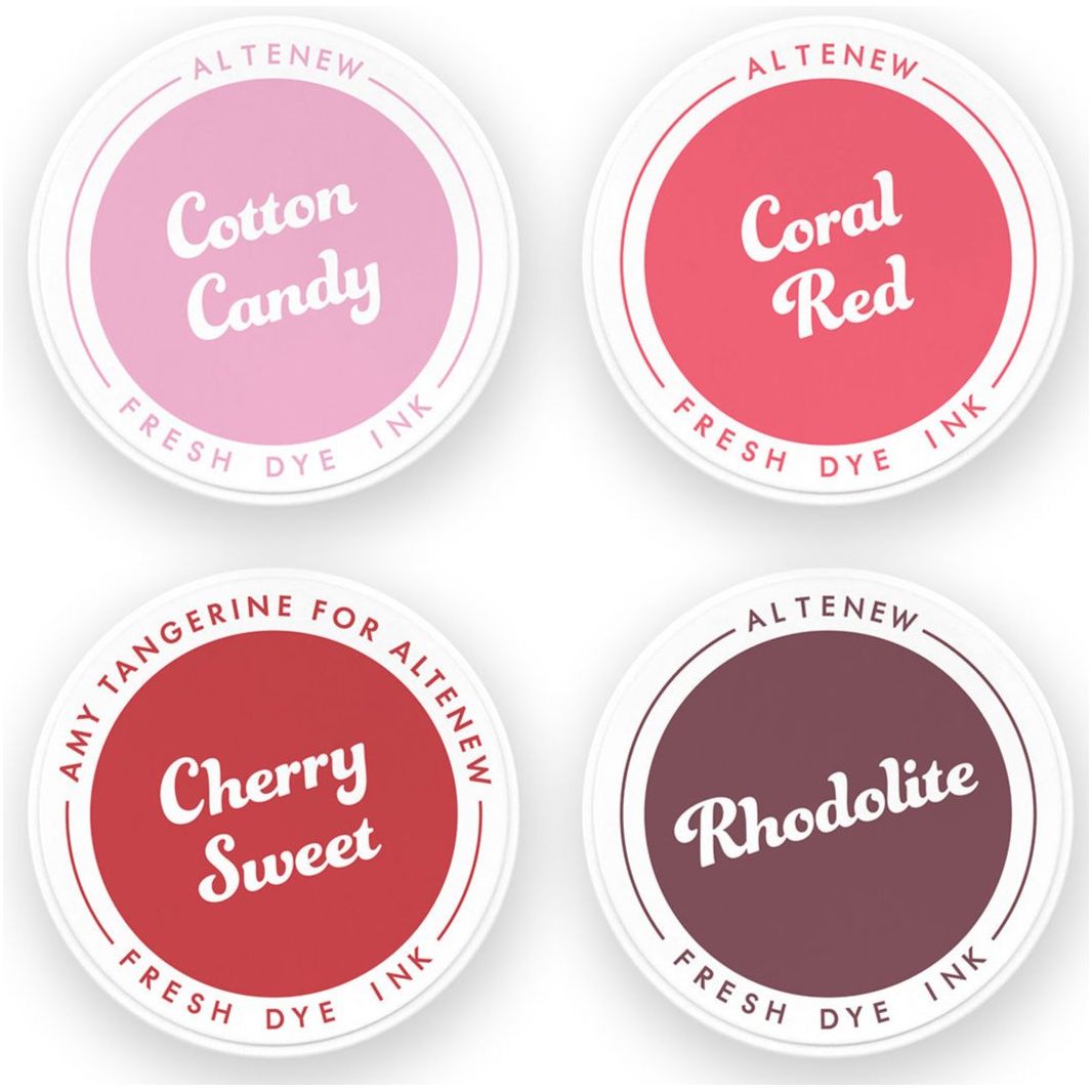 Altenew's ink color families are designed to eliminate the guesswork from layered stamping. Each family features a range of shades from light to dark, ensuring superior layering results. The Carnival Magic set includes the colors Cotton Candy, Coral Red, Cherry Sweet, and Rhodolite. Each set contains four 2.75 inch round felt dye ink pads. These water-based, fast-drying inks provide uniform coverage, and vibrant impressions. The pads are refillable, ergonomically designed, and made in the USA.