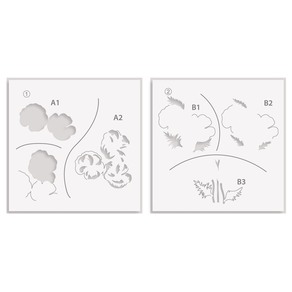 - A coordinating and complementing stencil set containing 2, 6x6 inch stencils.