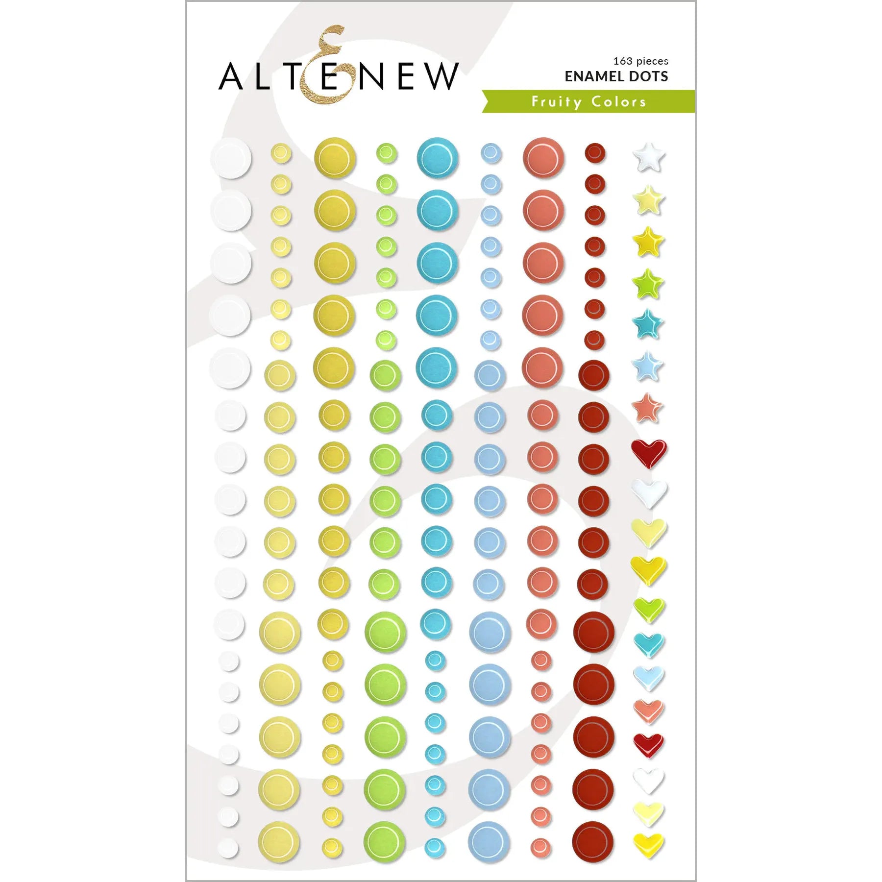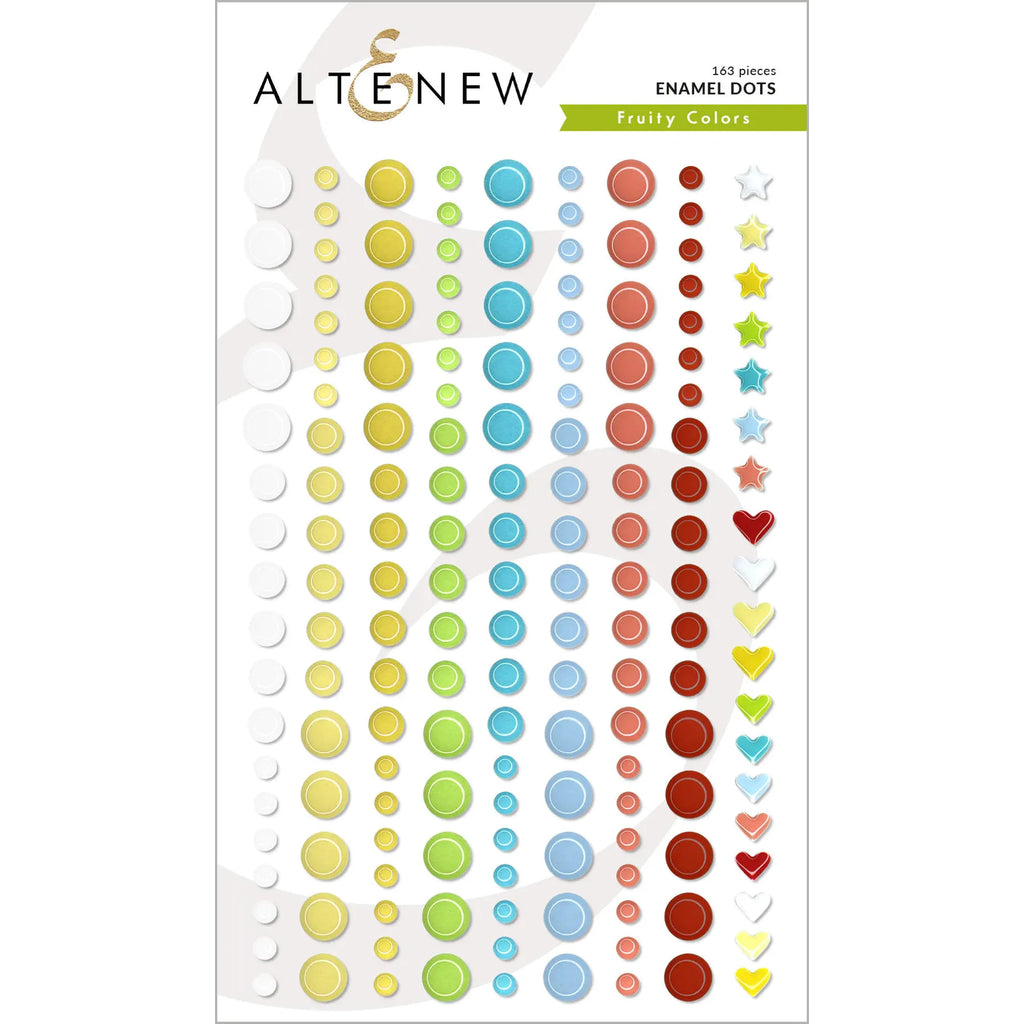 The Altenew Fruity Colors Enamel Dots are designed to add a touch of beauty and charm to your paper crafting projects. This special set includes 162 enamel pieces, featuring a delightful variety of three different sizes and 8 fruity colors, as well as some heart and star shapes.