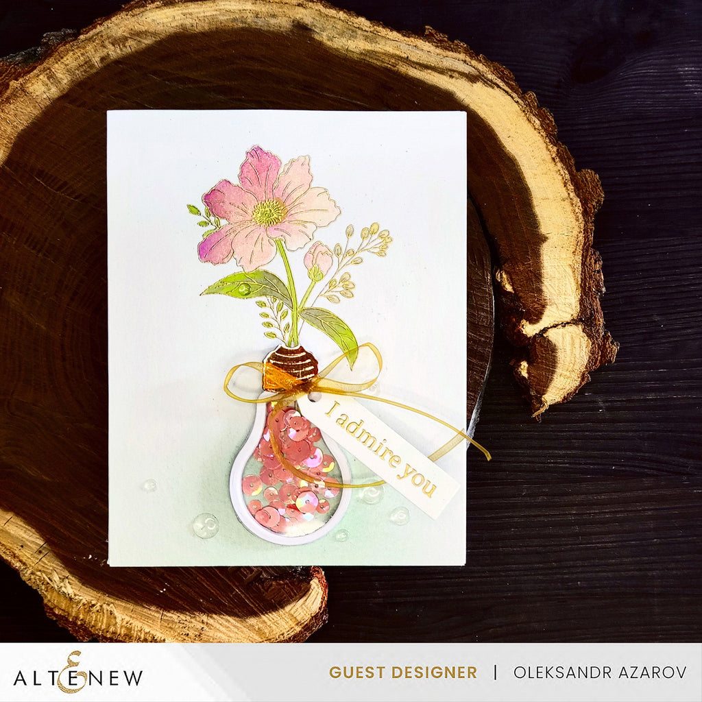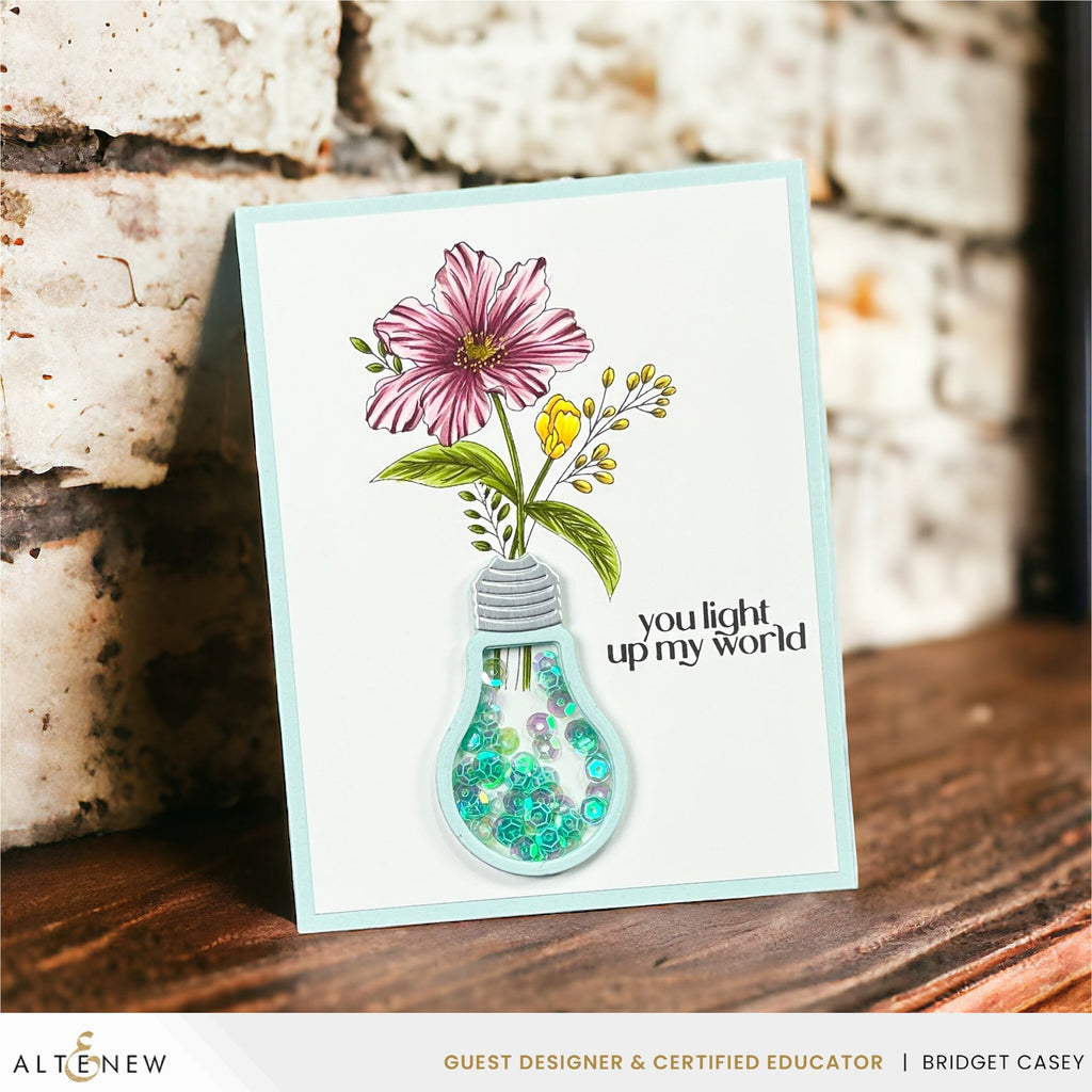 The Altenew Mini Delight: Light My World Stamp and Die Set offers a unique and charming floral arrangement alongside a versatile layered light bulb die set, accompanied by heartwarming sentiments.