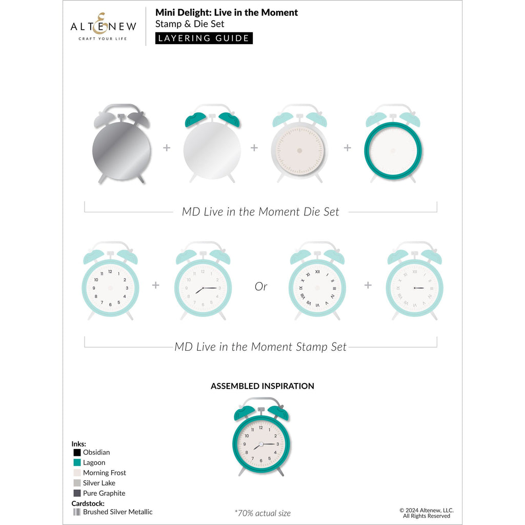 Embrace life's beauty with the 3 x 4 inch Mini Delight: Live in the Moment Set! This set features clock hands, dials, a lovely floral arrangement, and sentiments. The coordinating die set includes a fun layering clock. Combine both for exciting and unique handmade projects! There are 14 stamps in this set.