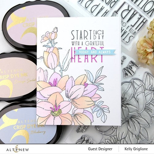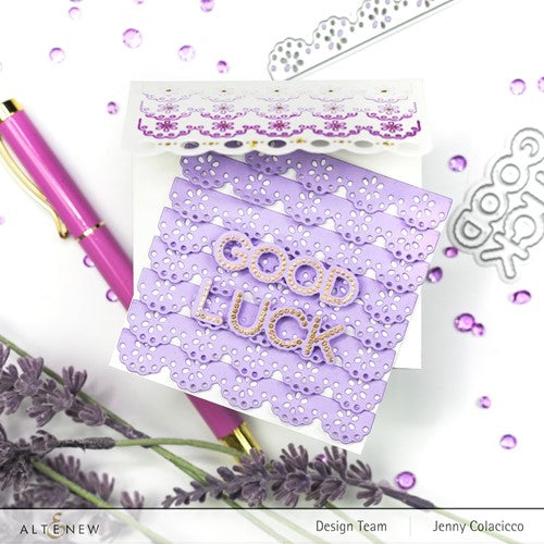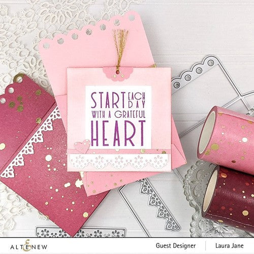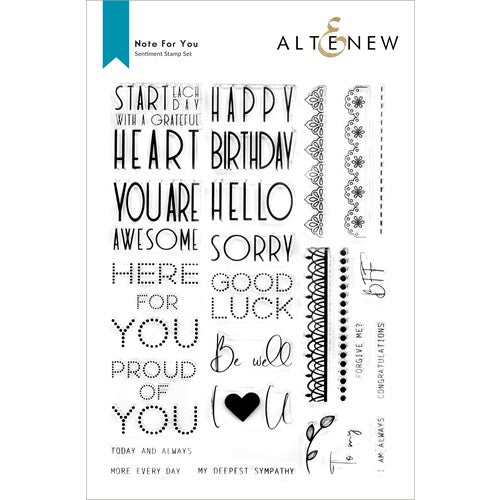 This stamp set contains greetings in different fonts ranging from bold to cursive and even dotted! The five detailed borders give you multiple options for adding accents to your projects, and the small leaf image is a charming finishing touch. The coordinating die set, sold separately, includes a die for creating an envelope for a 3 x 3 inch notecard.