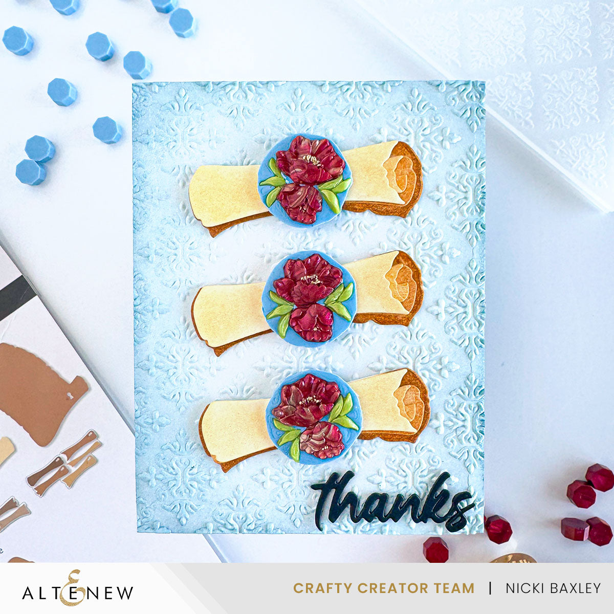Featuring Altenew's Key-Hole System, these dies allow for easy alignment and seamless layering. The set includes a large open scroll, a large rolled scroll, and two mini rolled scrolls, along with delicate embellishments such as mini bows and wrapped twine accents, designed to complement the large rolled scroll.