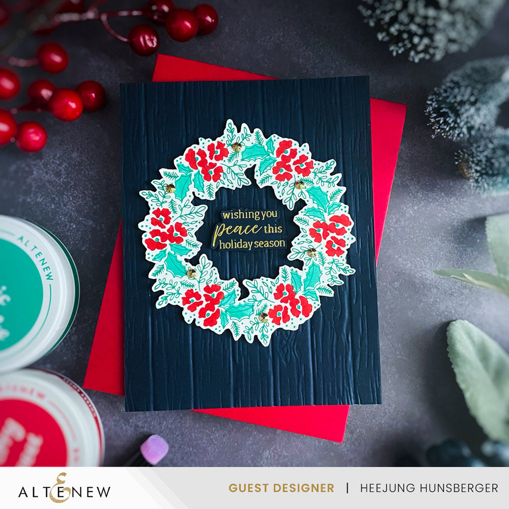 The Regal Wreath Press Plate, Altenew's first-ever registration press plate, features beautiful wreath designs that are ideal for adding a festive touch to your winter projects. The set also includes five holiday-themed sentiments to complete your designs.
